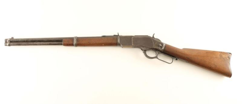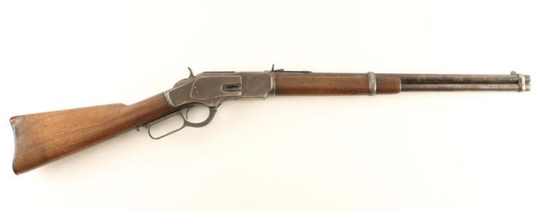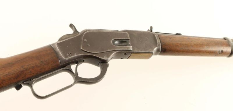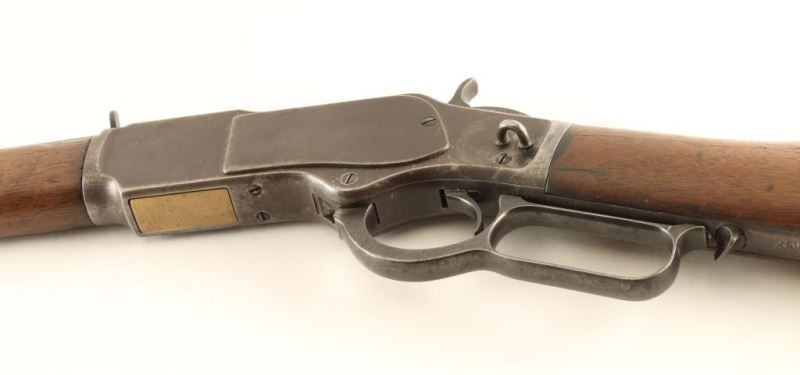 Third model 'SRC', circa 1893. King's Improvement 20" bbl, full length magazine tube, blade front sight, adjustable semi-buckhorn rear sight, no saddle ring or dust cover, two barrel bands, smooth walnut forend and straight grip shoulder stock with metal carbine trapdoor buttplate. The ramp on the rear sight extends over the receiver and the receiver has been flattened at the end to accommodate the ramp. Rifle displays a dark aged brown patina with some lighter silver tones from wear and pin prick pitting. Markings are good+, action is smooth, and bore is good+ with pin prick pitting. Wood stocks are fair showing numerous cracks and what appears to be water damage to the heel with a heavily pitted buttplate. Condition is good. ***Antique Firearm***