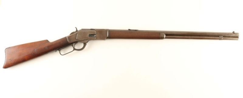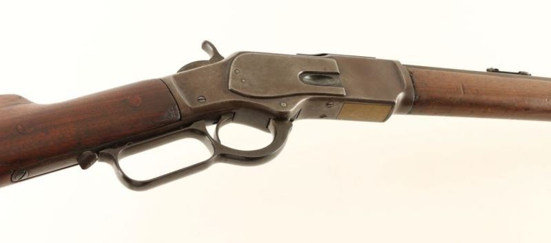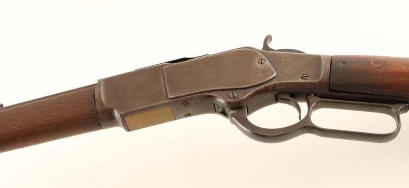 'Third Model' Antique American made lever action repeating rifle chambered in .44-40 Winchester, circa 1886. Features a Kings Improvement 26" octagonal barrel, dovetailed blade front sight, dual folding leaf rear sight, full length tube magazine, smooth trigger, knurled hammer spur, reproduction dust cover, grip safety, smooth walnut forend with metal cap and straight grip shoulder stock with a crude non-factory metal buttplate. Rifle exhibits a nice even aged brown patina with some scattered dings. Action is smooth, bore is good with some scattered pin prick pitting and wood stock are fair showing losses & a large repair around the wrist of the buttstock. Condition is NRA good. ***Antique Firearm***
