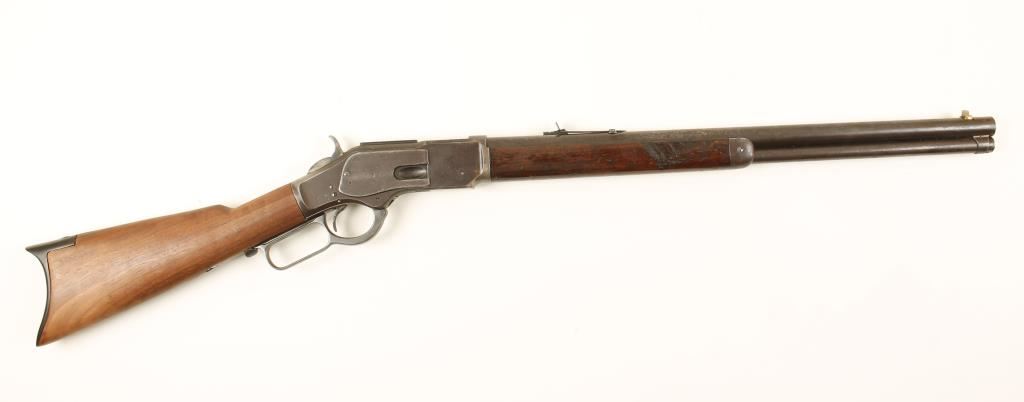 Lever Action Rifle, 20 1/2" round barrel, Brown to silver finish, missing dust cover, cut down replacement stock, replacement butt plate, forend refinished. Condition is overall fair due to finish and replacements. *Antique Firearm*