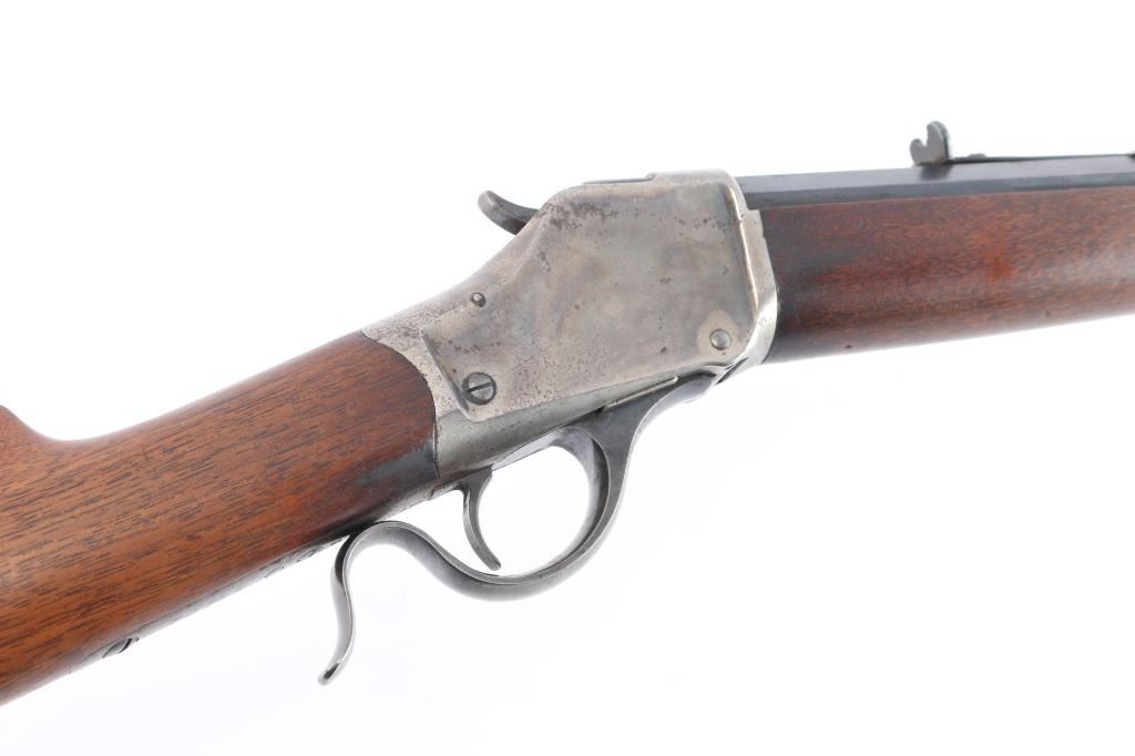 Winchester 1885 Model Hi Wall rifle in 40-82 caliber with 30 octagon #3 barrel. Blue and case-hardened finish with rifle butt. Approximately 75-85 percent original blue remains on the barrel with good markings and sharp edges. Standard rear sight with large blade front sight which is period but possibly not factory. 50-60 percent thinning and toning case colors on the frame. Good to very good wood with only minor imperfections and slight scratches, dings, mars, etc. Bore bright with strong rifling. An 8 on a 1-10 grading scale. Manufactured 1891.