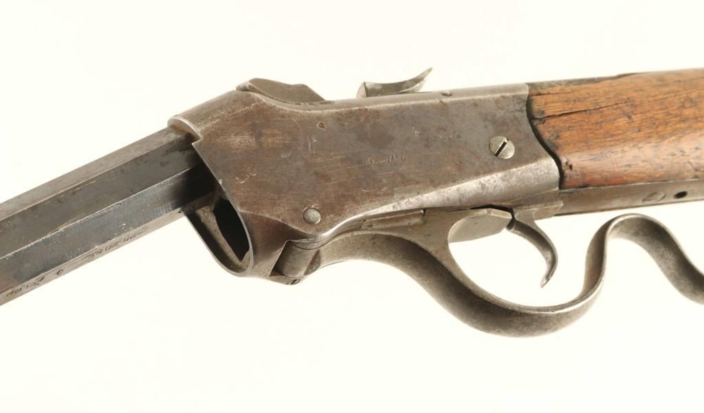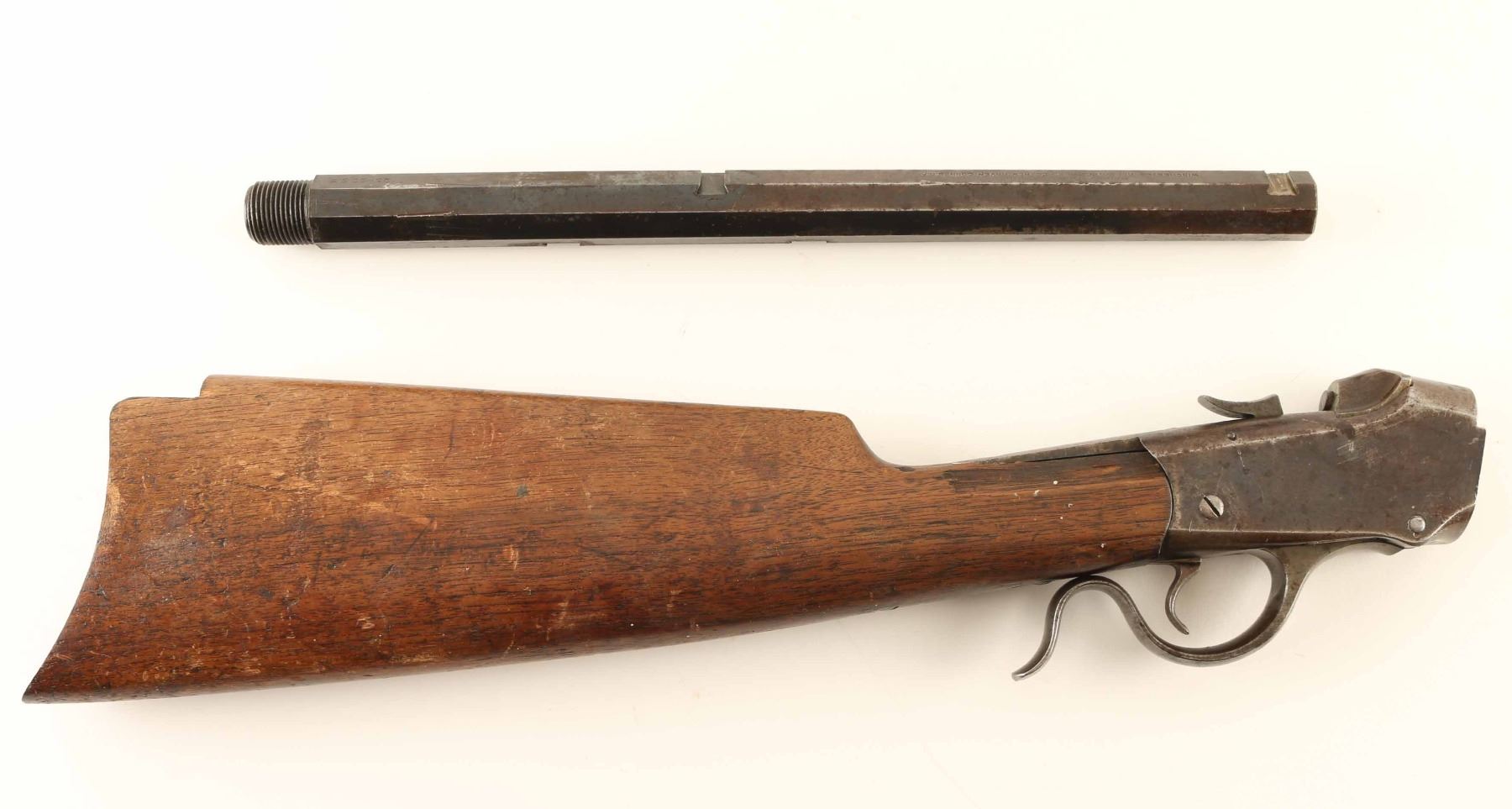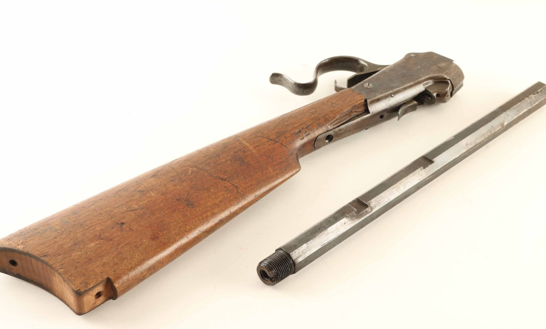 'Parts Gun' Low Wall 1885 receiver with breech block, lever, hammer, trigger and damaged buttstock. Includes a 13" cut portion of a .25-20 SS chambered barrel.