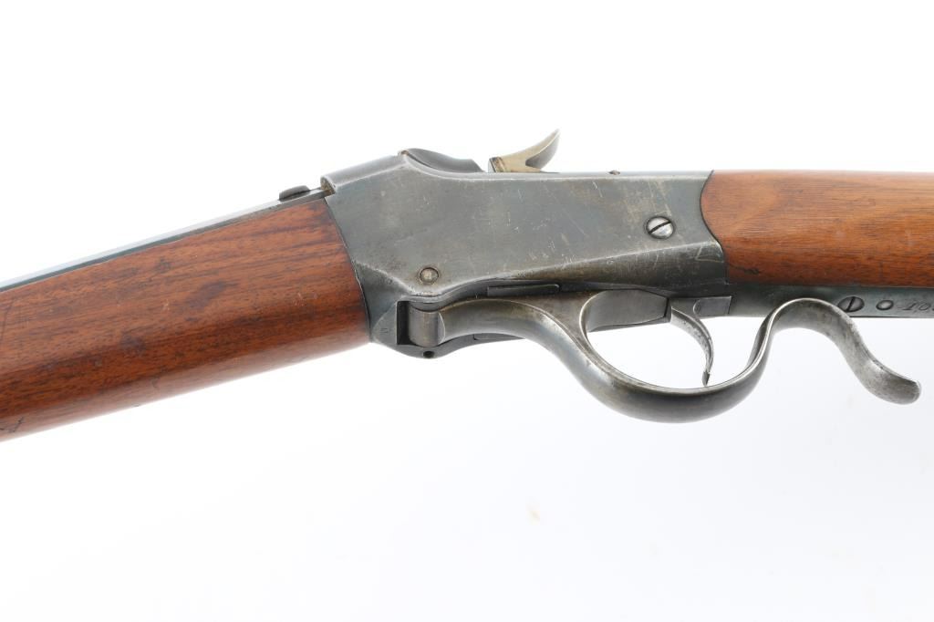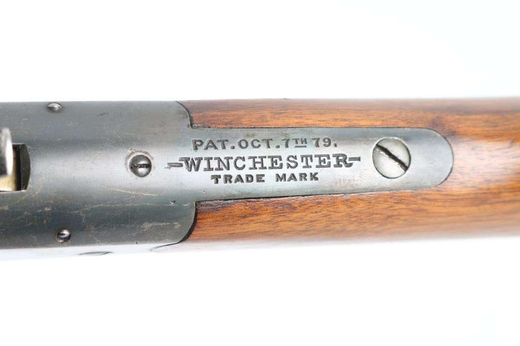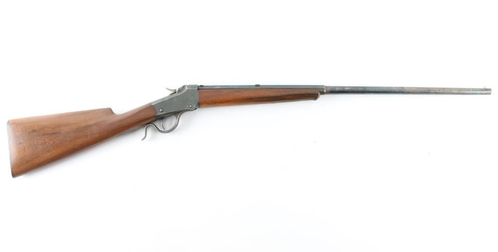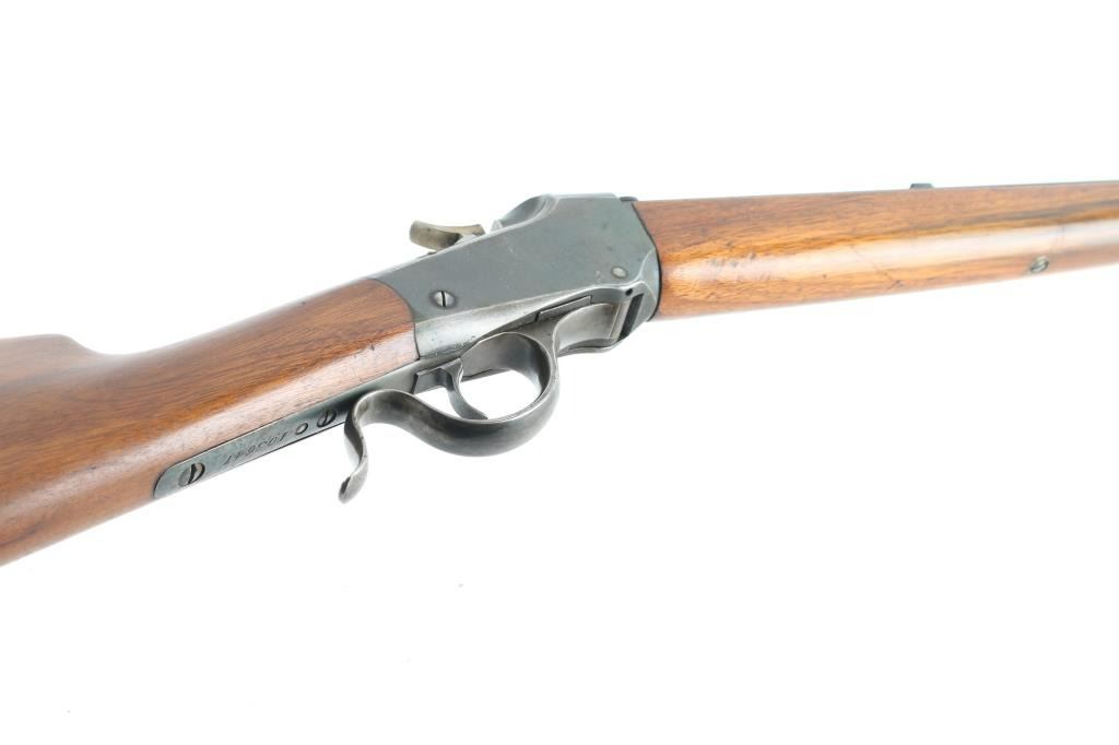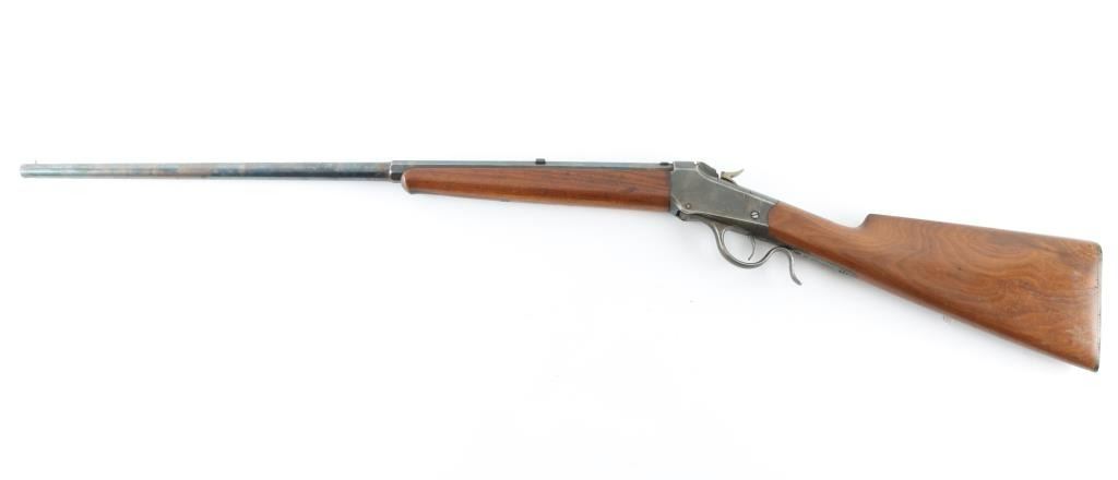 This is a Winchester M1885 Low wall , manufactured 1918, that was professionally converted to .410 Ga. (2.5" shells) by William Kirk, the consignor's great Uncle. He started out as a machinist in the mines in cripple Creek Colo. during the gold rush, and later became a gunsmith in Encampment, Jackson Hole, and Rawlins, Wyoming in the early 1900's. He made these for sheep herders where there was a market for them. Lever-action, drop breech. 26 1/2" octagonal to round barrel with steel bead, and rear sight insert grooved for sighting. Lower barrel is stamped "410", "12mm" and "W.M. Kirk". ".22" is lined out, partially obscured by sight base insert just froward of the receiver. Serial number on lower tang. Winchester markings on upper tang. Bore appears excellent/bright, action is smooth/tight. Drop in choke gauge shows a bit more open bored than CYL. Wood is very good with normal scratches/dings, contrasting black painted fore cap. Factory checkered plastic buttplate. Blued metal finish is about 60% with scratches. handling/edge wear with scattered areas of pin-prick pitting, rust spots on the upper barrel. Great Western History, can be researched in newspapers, and the Wyoming Project. NRA Condition-Good as C& R Firearm