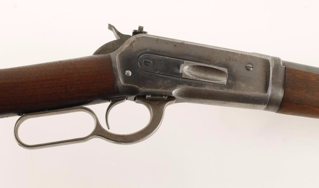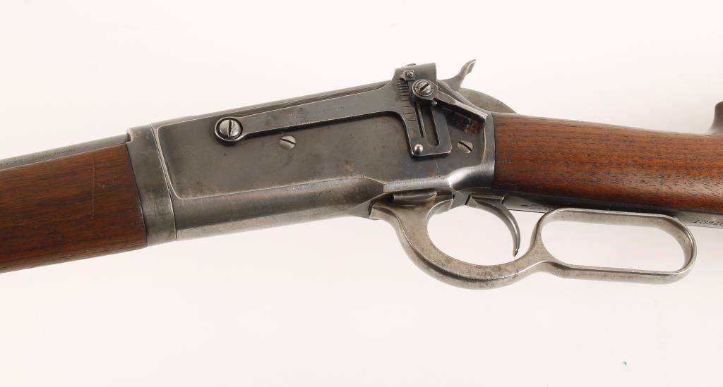 Take-down lever action repeating rifle chambered in .33 Winchester Center Fire, circa 1906. Features a blued finish, 24" barrel, Lyman blade front sight, Marble blank inserted in rear sight, Lyman adjustable aperture receiver sight, case hardened lever, 1/2 tube magazine, metal forend cap, smooth trigger, checkered hammer spur, plain straight grain walnut forend and straight grip shoulder stock with black checkered hard rubber buttplate. Barrel retains 75% thin bluing with light muzzle wear and scattered small spots of pitting. Receiver retains 50% bright bluing with light pitting on right side near hammer. Wood stocks are near fine with "JDL" stamped in both and a small loss on right side of forend. Action is tight and bore is excellent. Condition is very good+ as vintage. ***C&R Firearm*** ***Modern Firearm***