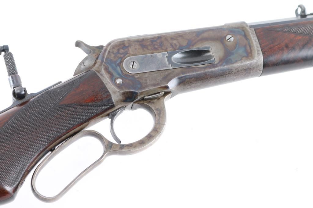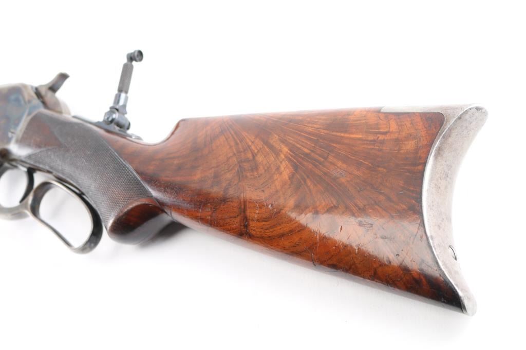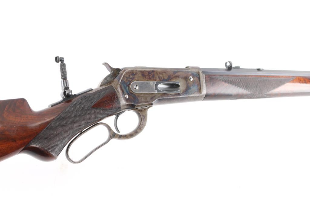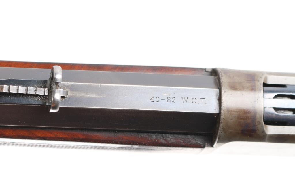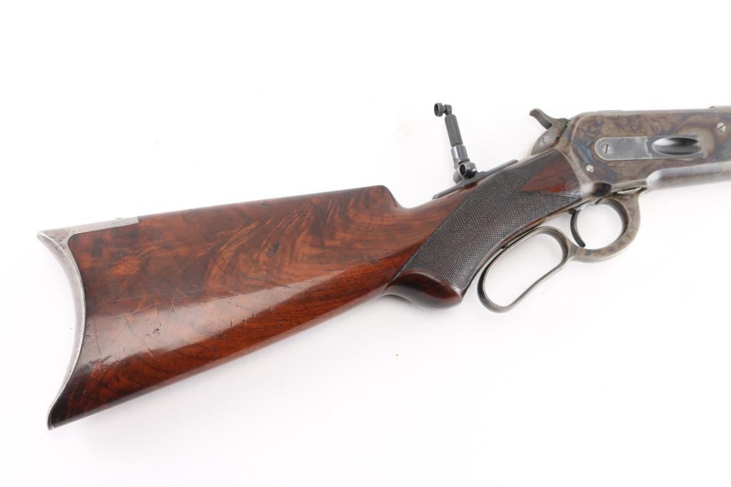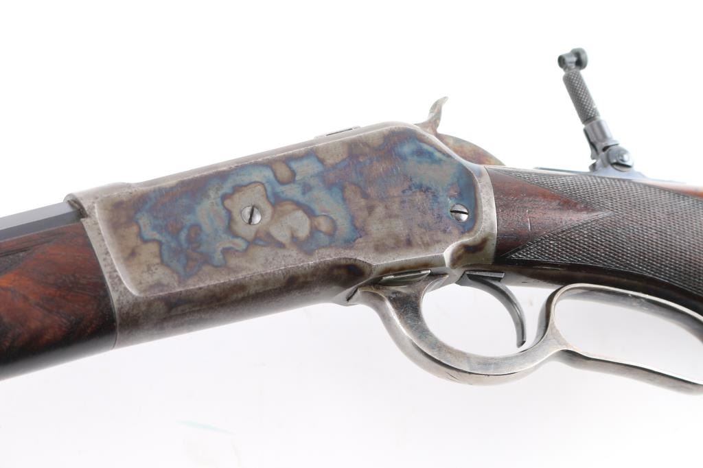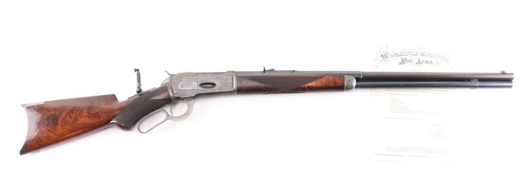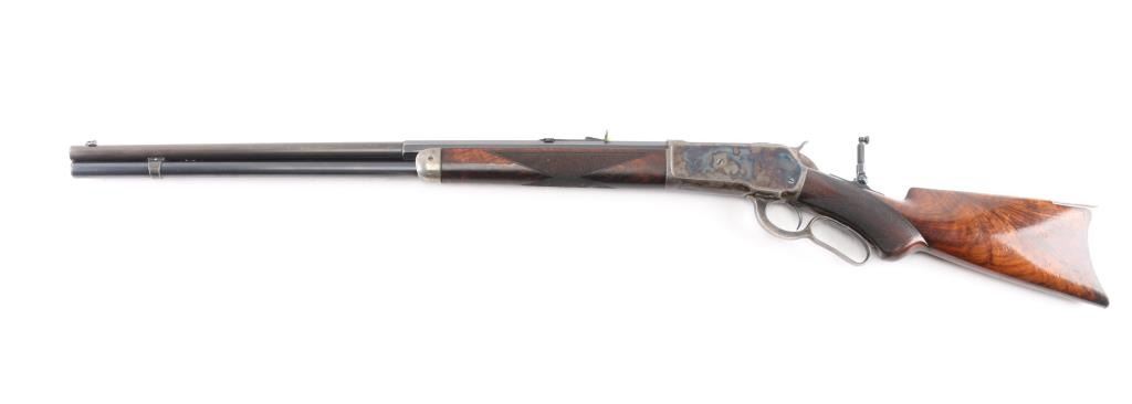 Stunning, deluxe, special order lever action repeating rifle chambered in .40-82. Manufactured in New Haven, CT circa 1890. Features a blued 26” half-round half octagon barrel, Lyman beach front sight with ivory bead, elevation adjustable buckhorn rear sight, Lyman tang mounted peep sight, full-length tube magazine, smooth curved trigger, knurled hammer spur w/ ‘widow’s peak’, case hardened receiver, curved finger lever, “H” pattern hand checkered XX walnut forend and pistol grip shoulder stock with ebony inlaid grip cap and crescent metal buttplate. The top barrel flat has the two-line Winchester address ahead of the rear sight and "40-82 W.C.F." at the breech. The lower tang has the two-line patent dates marking and the serial number. Rifle retains approximately 60% of its original bluing with the balance turned to brown patina & approximately 65% of its cased hardened colors mostly on the lever & receiver, with handling loss on the under side of receiver, traces on the fore cap, & the buttstock in the white. The action is mechanically sound, the bore is bright with light frosting, the markings are crisp/clear and the fancy walnut stocks are very good with minor blemishes. Includes a factory letter confirming all current features as original with the possible exception of the barrel which states “Barrel Type: Octagon”.