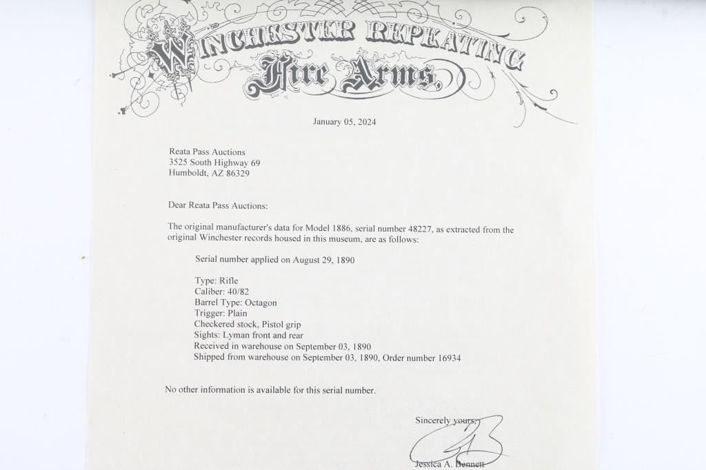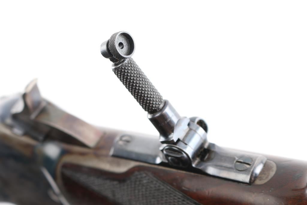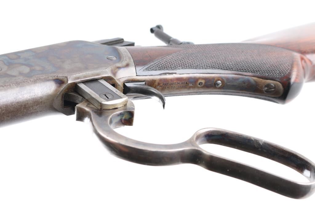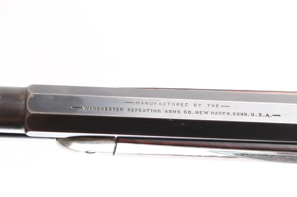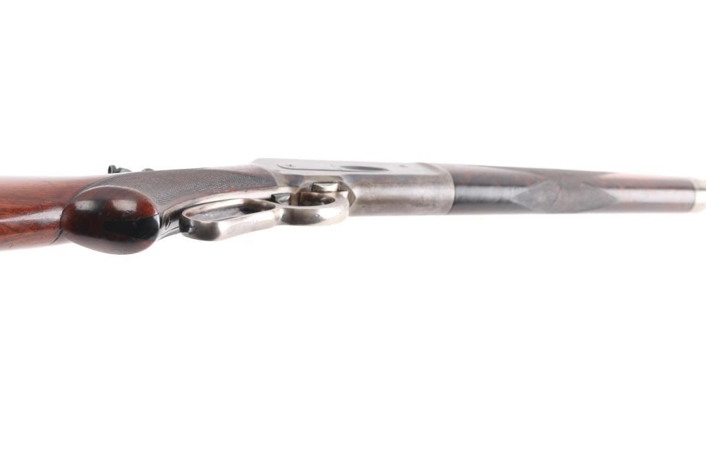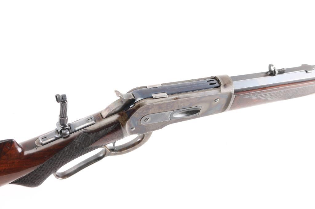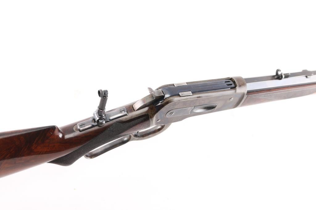 Stunning, deluxe, special order lever action repeating rifle chambered in .40-82. Manufactured in New Haven, CT circa 1890. Features a blued 26” half-round half octagon barrel, Lyman beach front sight with ivory bead, elevation adjustable buckhorn rear sight, Lyman tang mounted peep sight, full-length tube magazine, smooth curved trigger, knurled hammer spur w/ ‘widow’s peak’, case hardened receiver, curved finger lever, “H” pattern hand checkered XX walnut forend and pistol grip shoulder stock with ebony inlaid grip cap and crescent metal buttplate. The top barrel flat has the two-line Winchester address ahead of the rear sight and "40-82 W.C.F." at the breech. The lower tang has the two-line patent dates marking and the serial number. Rifle retains approximately 60% of its original bluing with the balance turned to brown patina & approximately 65% of its cased hardened colors mostly on the lever & receiver, with handling loss on the under side of receiver, traces on the fore cap, & the buttstock in the white. The action is mechanically sound, the bore is bright with light frosting, the markings are crisp/clear and the fancy walnut stocks are very good with minor blemishes. Includes a factory letter confirming all current features as original with the possible exception of the barrel which states “Barrel Type: Octagon”.