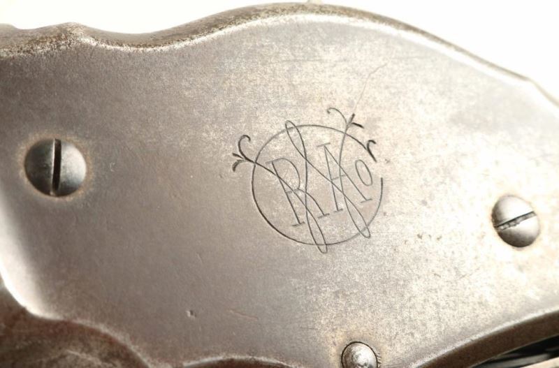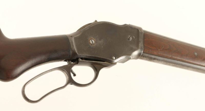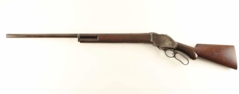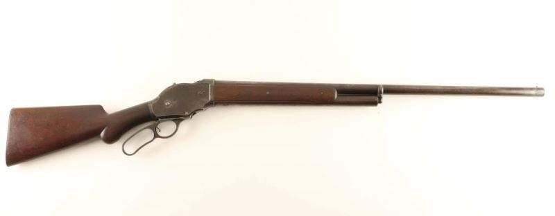 Antique American made lever action repeating shotgun chambered for black powder 12 gauge shells, circa 1891. Features a blued/case hardened finish, 30" barrel, brass bead front sight, 1/2 length tube magazine, exposed hammer with knurled spur, steel receiver with WRA Co monogram, curved lever, smooth walnut forend scales, and pistol shoulder stock with round knob, checkered metal buttplate & 12 3/4" LOP. Shotgun exhibits only trace amounts of finish in the protected areas. The majority of the metal surfaced have turned to an aged brown patina showing wear on the barrel & magazine tube from carrying and also show some light scattered pitting on the barrel near the muzzle. Action is smooth though the breech block will not lock into battery and must be held closed with the lever. Bore is semi-bright with light scattered pitting throughout and the wood stocks are good+ with some small losses & imperfections. Condition is very good. ***Antique Firearm***