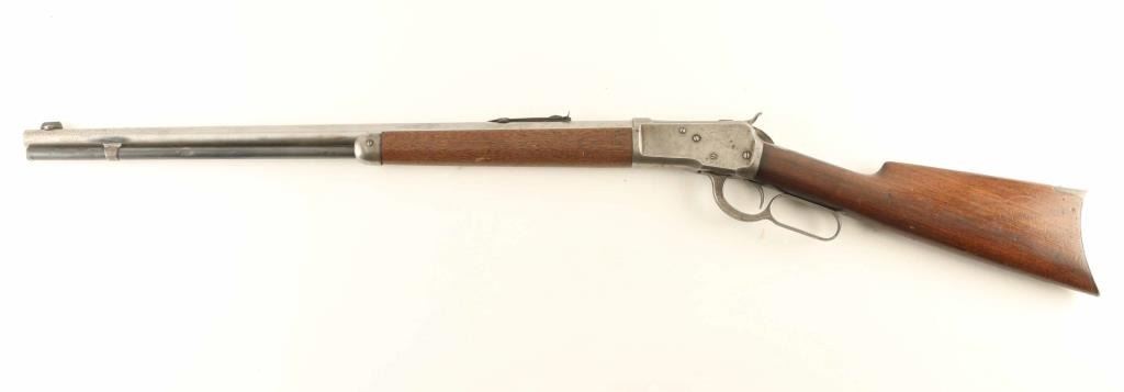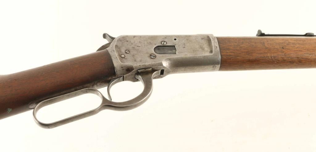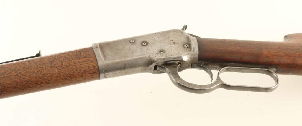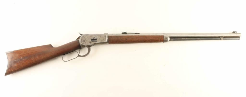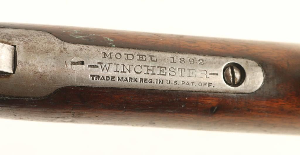 Lever action rifle features 24" barrel, buckhorn sights, full length magazine tube under barrel, steel crescent buttplate. Bore is excellent condition. Barrel is in the white, satin finished, with worn/polished streak near mag tube band, areas of patina beginning to form in places. Sights are blued, very good condition. Mag tube and lever are blued, turning brown or gray with some bare metal in places. Receiver is mostly grayish silver with traces of brown coloration in scallops and around screw heads. Wood is good to very good, scratched and dented with no observed cracks. Condition is NRA Good +++ C&R Firearm ***