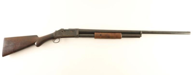 Scarce vintage slide action shotgun, circa 1893-1897. Old blued refinish, 30" bbl w/ 2 5/8" chamber, 1/2 length tube magazine, brass bead front sight, replacement slide handle, steel receiver and smooth walnut pistol grip shoulder stock with metal buttplate. Shotgun exhibits approximately 15-20% of it's refinish with scattered pitting, some deep scratches and rust. Markings are soft, action is tough & will not go fully rearward, bore is fair and the original buttstock is fair. Condition is fair. ***Antique Firearm***