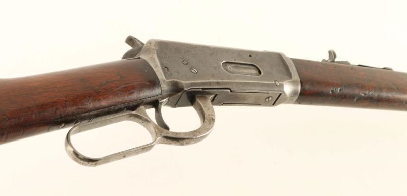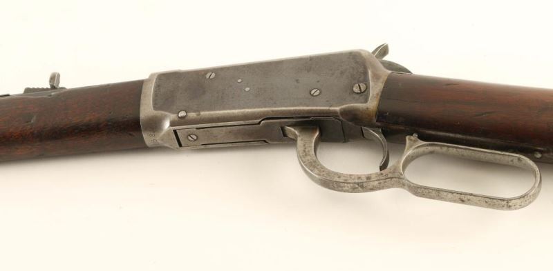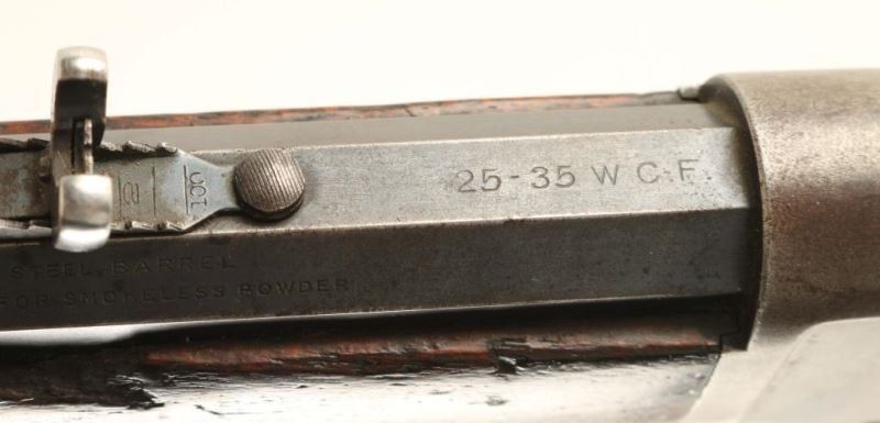 Early lever action repeating rifle chambered in .25-35 Winchester, circa 1896. Original blued finish, 26" octagonal barrel, full length tube magazine, D.W. King blade front sight, King adjustable semi-buckhorn rear sight, smooth trigger, grip safety, fancy knurled hammer spur, smooth walnut forend with metal cap and straight grip shoulder stock with crescent metal buttplate. Rifle retains approximately 50% of it's thinned original finish showing honest wear with some oxidation & light pin prick pitting. Action is sound, bore is very good and wood stocks are fair with some gauges, dents & cracks around the wrist. Condition is very good. ***Antique Firearm***