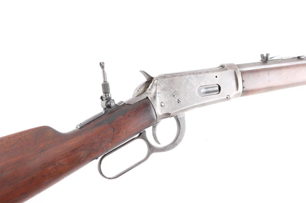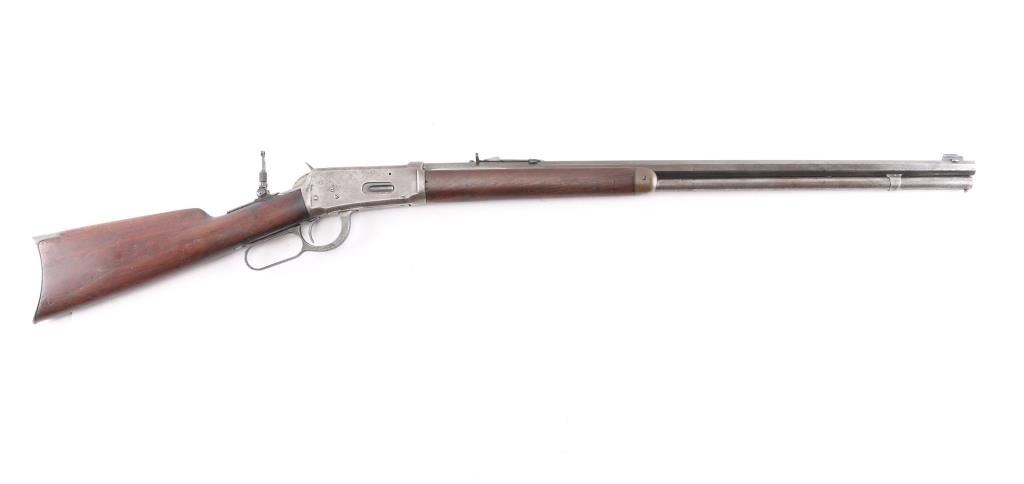 Vintage lever action rifle manufactured circa 1899. Features 26" octagon barrel, full length magazine tube, dovetailed Marbles blade/bead front sight, adjustable sporting rear sight, vintage Lyman peep sight installed on tang. smooth walnut forend & straight wristed buttstock, carbine butt with curved steel buttplate. Bore is good condition, frosted and a bit gray, lightly pitted, strong rifling. Original blued finish has turned a gray/brown molted patina with scattered areas of light pin-prick pitting, some small dents on top of the receiver. Wood is very good overall, lightly varnished with minor scratches/dings, there is a small hairline crack on the left forearm. Markings are readable, generally sharp. Action is smooth.