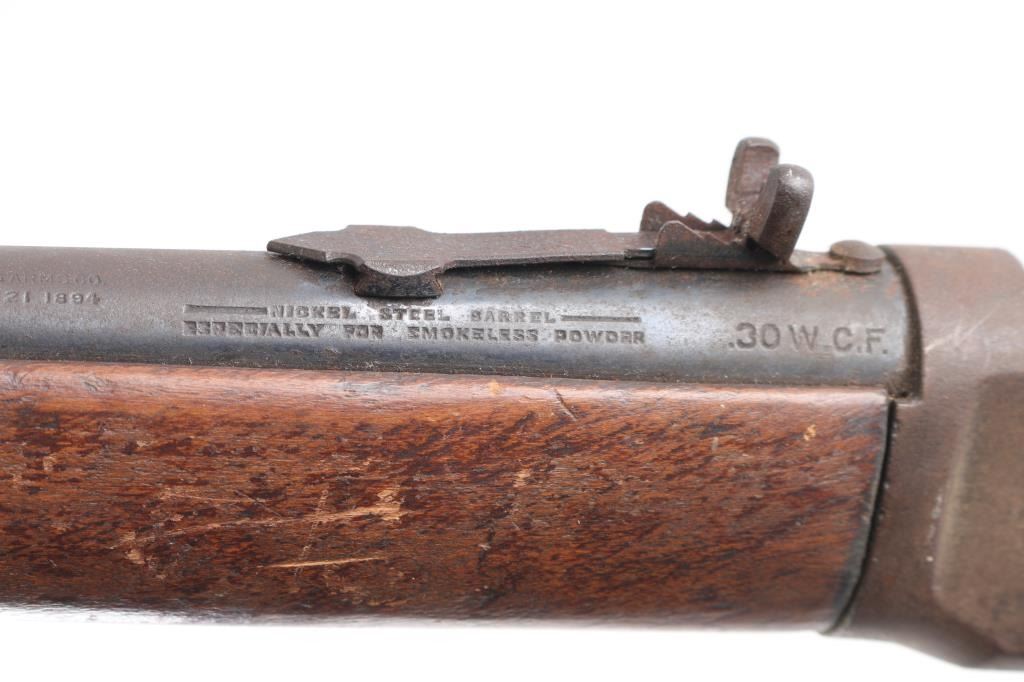 'Saddle Ring Carbine' Vintage lever action rifle manufactured circa 1906. Features 20" barrel, full length magazine tube, dovetailed blade front sight, buckhorn rear sight, smooth walnut forend & straight wristed buttstock, carbine butt with curved steel buttplate. Rifle is in relic condition. Bore has rifling, but is dark/rough. Metal surfaces have surface rust/light pitting, the wrist in cracked, and repaired with what appears to be copper wire. Action works well. All markings are clea, except on the tang where it is covered by the wire. The saddle ring is a period replacement, being smaller that it should be. Rifle has seen very hard use, possibly used by Native Americans.