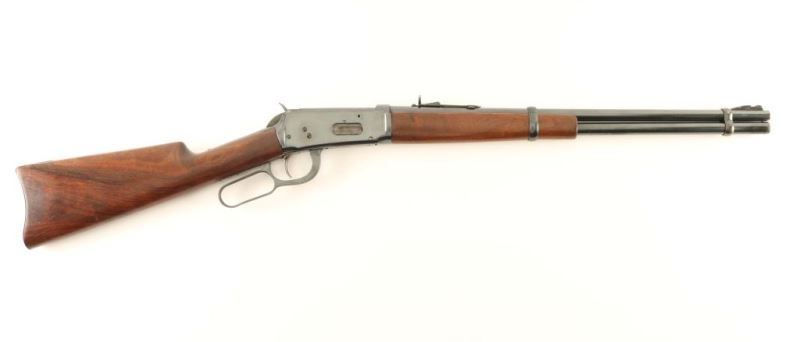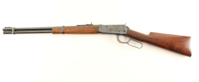 Antique lever action repeating rifle, circa 1896. Blued refinish, replaced 20" bbl & magazine tube, two barrel bands, no front sight, Marbles semi-buckhorn rear sight, refinished receiver, metal carbine butt and smooth walnut stocks. The barrel and magazine tube exhibits approximately 90% of their blued finish showing some light scattered surface rust on the magazine tube. The refinished exhibits some old pitting under the finish and 'new' pitting. Action is crisp, bore is excellent and wood stocks are very good w/ a small amount of filled used at the end of the upper tang. Condition is good+. ***Antique Firearm***