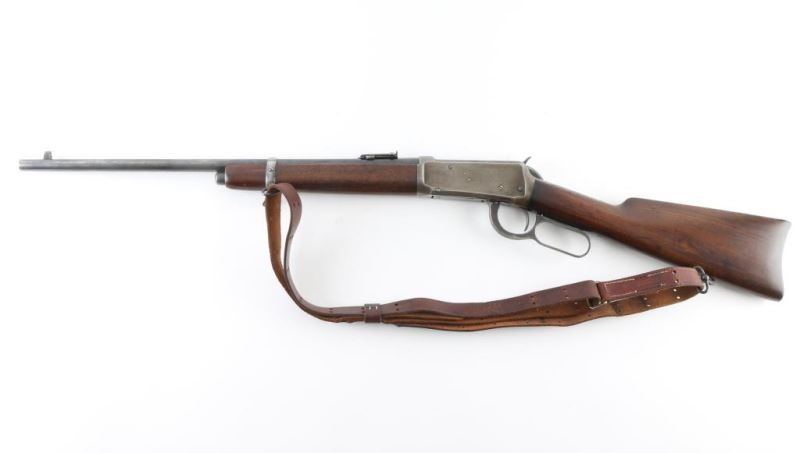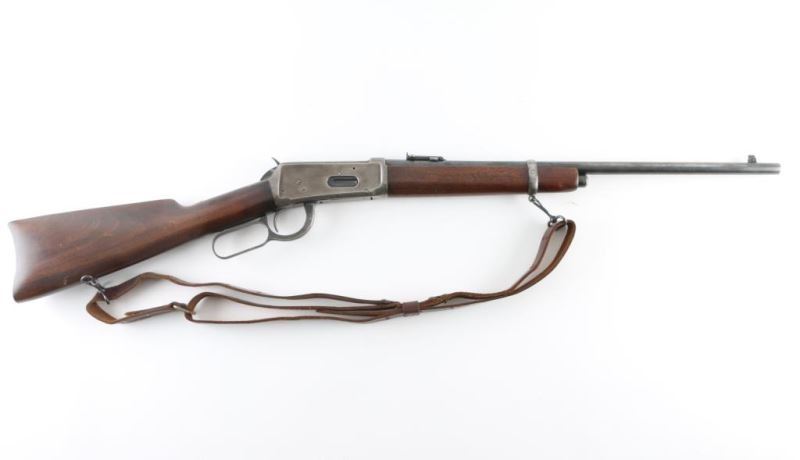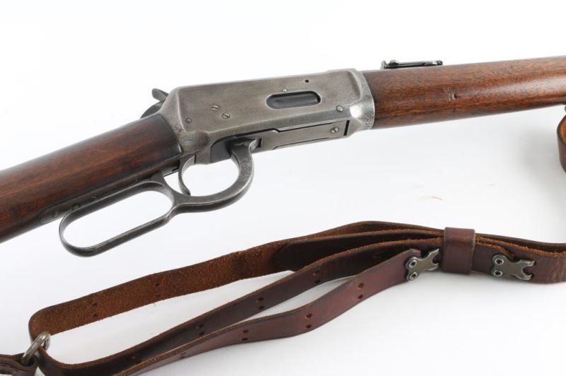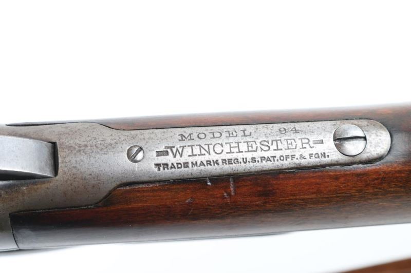 Rifle. Lever Action. Vintage rifle manufactured 1921. Half length magazine (1894-1937) 20" barrel with half length tube magazine. Front blade and u-notch ladder rear sights. Standard Winchester markings on barrel/tang. Winchester proofs. Barrel also marked "Nickel Steel barrel, Especially for Smokeless powder." Action is crisp/tight. Bore is good with strong rifling. Blued barrel is a little dull with some handling loss. Lever has traces of blue. Receiver, barrel band and curved buttplate have turned a gray patina with areas of light pitting. Nothing serious. Wood is very good with minor scratches/dings. Appears to be gumwood. Brown leather sling attached. Sling swivel on barrel band has been brazed. Some very small letters etched on the lower tang, hard to read. NRA condition-Good. C&R Firearm.