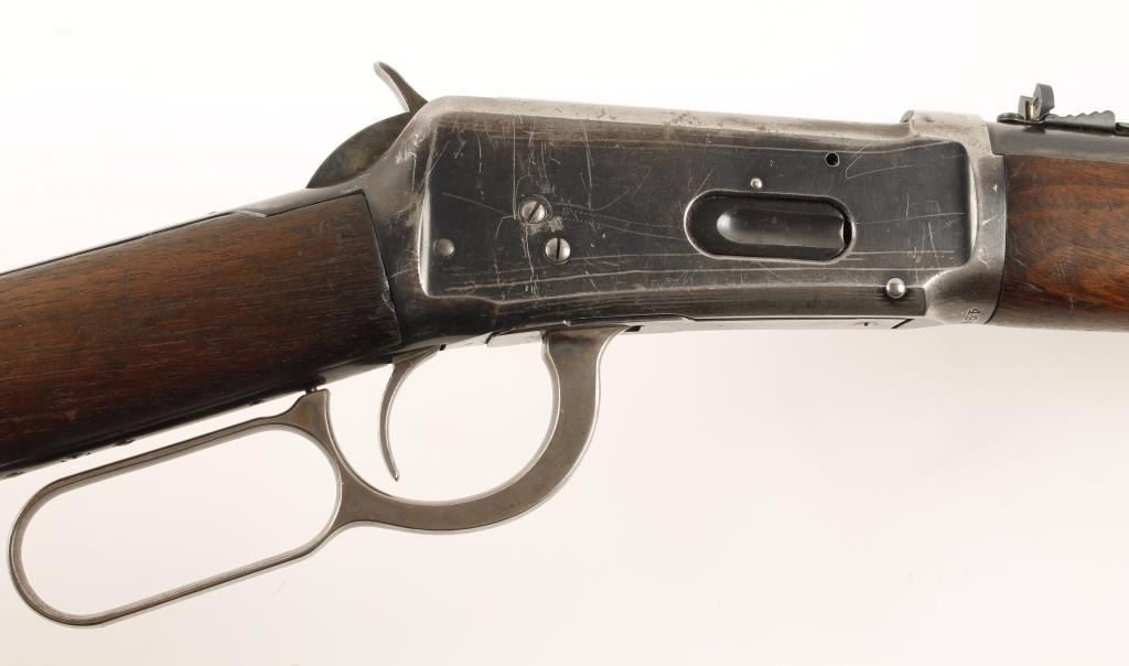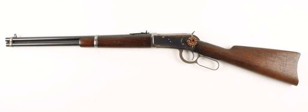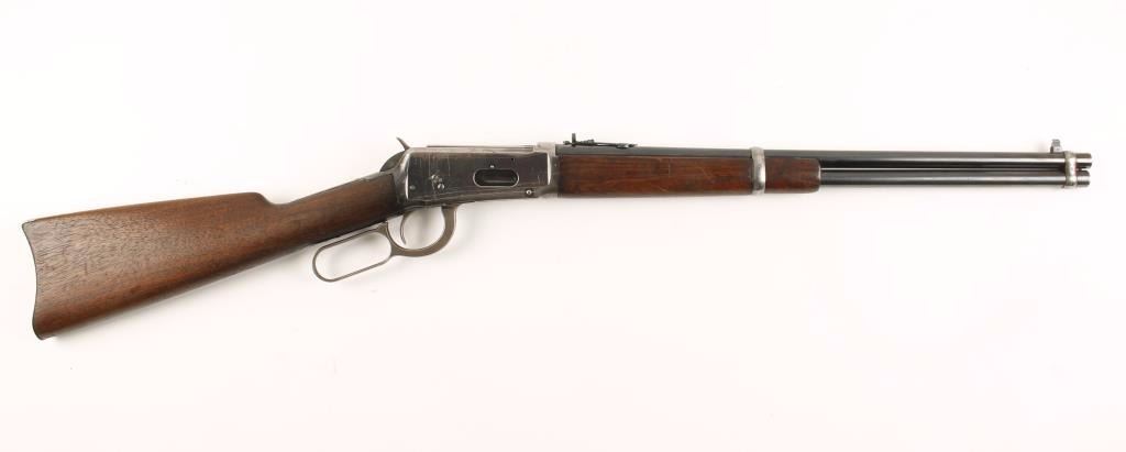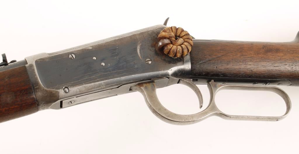 Early tube-fed lever action saddle ring carbine chambered in .30 Winchester Center Fire, circa 1909. Features a blued finish, 20" tapered barrel, full tube magazine, Sheard blade front sight, Marbles semi-buckhorn style rear sight, leather wrapped saddle ring, case hardened loading lever, metal carbine buttplate, plain walnut forearm and straight grip shoulder stock. Finish retains 65% original bright blue finish with high edge wear on receiver, virtually no wear on barrels, wear from a removed tang sight and case hardened lever turned to bare metal with areas of bright colors in protected areas. Markings are crisp, action is strong, bore is very good and stocks are near fine with few scratches and dings. Condition is very good. ***C&R Firearm*** ***Modern Firearm***