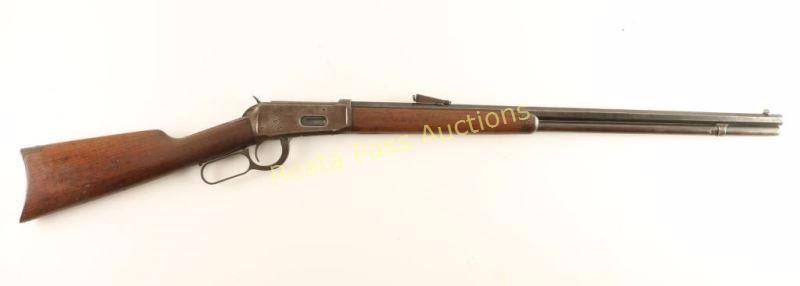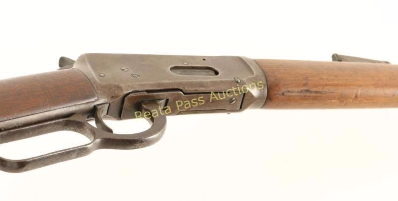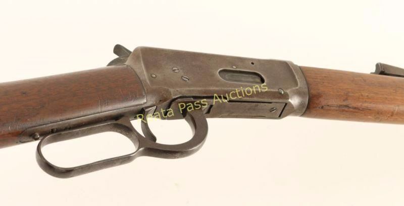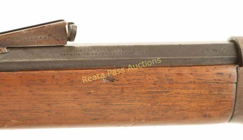 Vintage tube-fed lever action repeating rifle chambered in .32 Winchester Special, circa 1913. Features a blued finish, 26" octagonal barrel, full length tube magazine, Marble No. 3 blade front sight with brass bead, rare Winchester high velocity smokeless powder rear sight, checkered hammer spur, smooth trigger, drilled & tapped upper tang, grip safety, metal forend cap, smooth walnut forend and straight grip shoulder stock with crescent metal buttplate. Rifle retains approximately 12% if it's blued finish overall showing rounded edges on the barrel, a few small spots of dark rust, and the remainder of the metal surfaces turned to a dark grey/brown patina. Action is smooth, bore is near excellent, markings are good, and wood stocks are good some cracks & gouges. Condition is good+. ***C&R Firearm*** ***Modern Firearm***