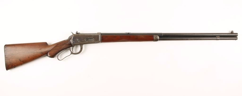 Tube fed lever action repeating rifle chambered in .32 Winchester Short, circa 1899. Features a blued 26" half octagonal barrel, full tube magazine, Marbles blade front sight, removed rear sight with installed blank, adjustable Lyman aperture sight mounted on receiver, metal forend cap, smooth trigger, checkered hammer spur, hand checkered walnut forend and pistol grip shoulder stock with hard rubber pistol grip cap & metal shotgun buttplate. Finish retains 25% original deep bluing mixed with dark patina and bare metal. Rifle shows light pitting near muzzle on barrel and small spots of dark rust on lever. Wood stocks have been refinished & checkered and are smaller than they once were. Action is smooth and bore shows very good rifling. Condition is very good as near antique. ***C&R Firearm*** ***Modern Firearm***