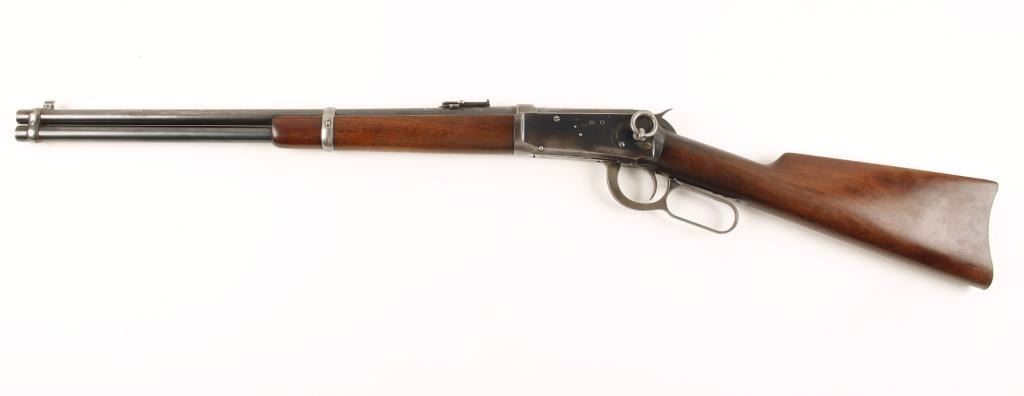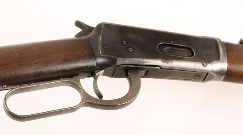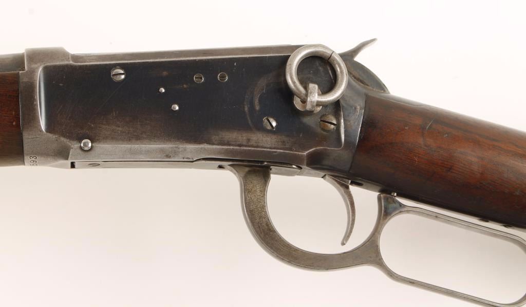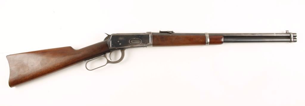 Lever action saddle ring carbine chambered in .38-55 Winchester Center Fire, circa 1900. Features a blued finish, 20" tapered barrel, full magazine tube, blade front sight, folding leaf adjustable elevation rear sight, saddle ring, case hardened lever, checkered hammer spur, smooth trigger, straight grain plain walnut forend, and straight grip shoulder stock with metal carbine buttplate. Receiver has been drilled and tapped for a side mount sight and has been filled in with set screws. Rifle retains overall 60% original bluing with wear from carrying and storage. Lever shows good case colors in protected areas. All markings are clear, action is smooth, bore is very good, and wood stocks are fine with minimal blemishes. Condition is very good as vintage. ***C&R Firearm*** ***Modern Firearm***