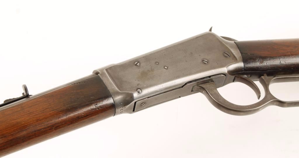 Tube-fed lever action repeating rifle chambered in .38-55, circa 1907. Features a cut-down 21.5" blued barrel, 3/4 magazine tube, blade front sight with set screw, buckhorn rear sight, checkered hammer spur, case hardened receiver & lever, smooth trigger and plain walnut forend and straight grip shoulder stock with metal crescent buttplate. Finish shows 40% drifting bluing with small scattered areas of light pitting. Action is good, bore has very good rifling and stocks are very good. Condition is good as near antique. ***C&R Firearm*** ***Modern Firearm***