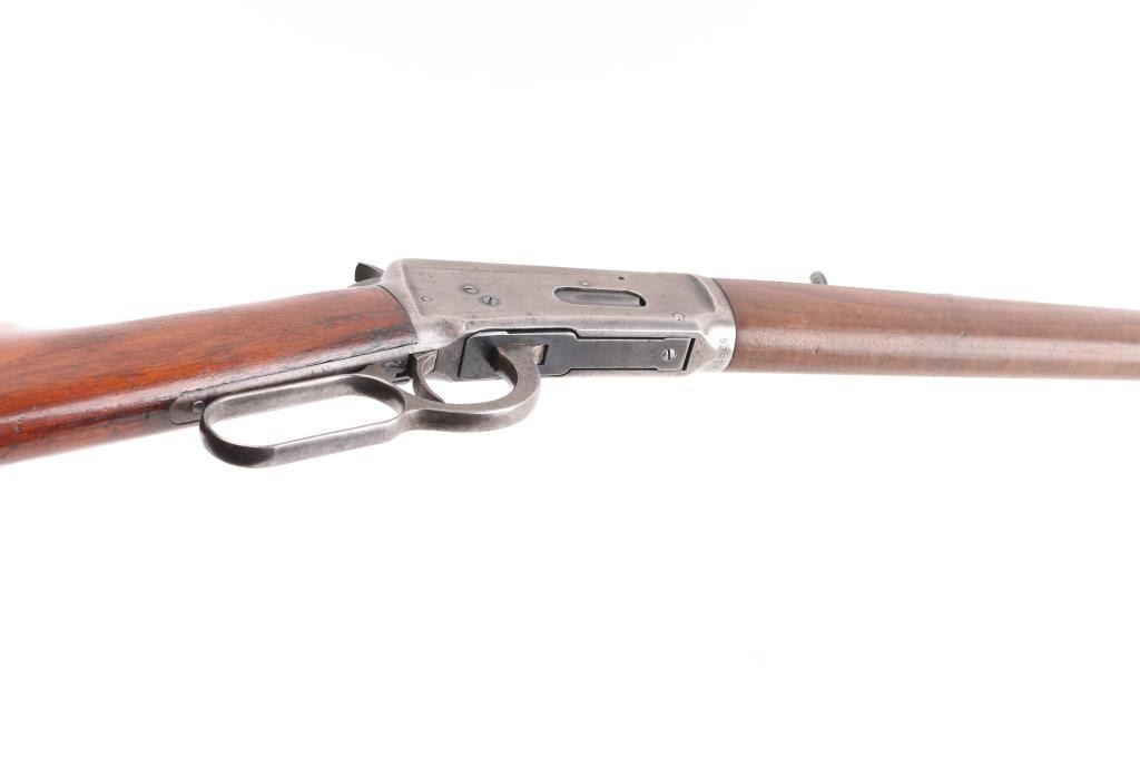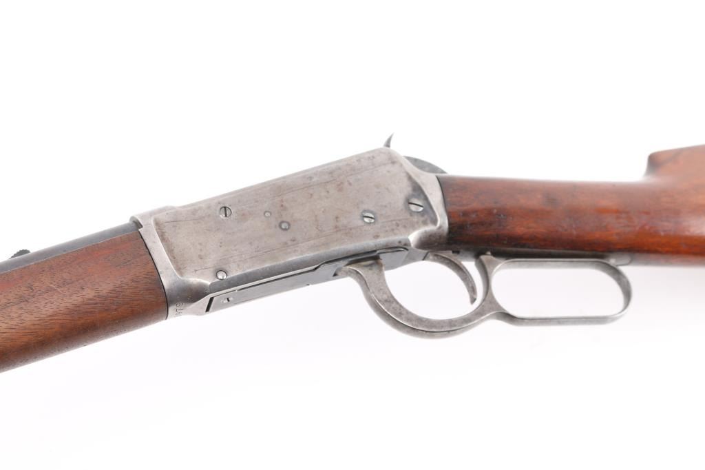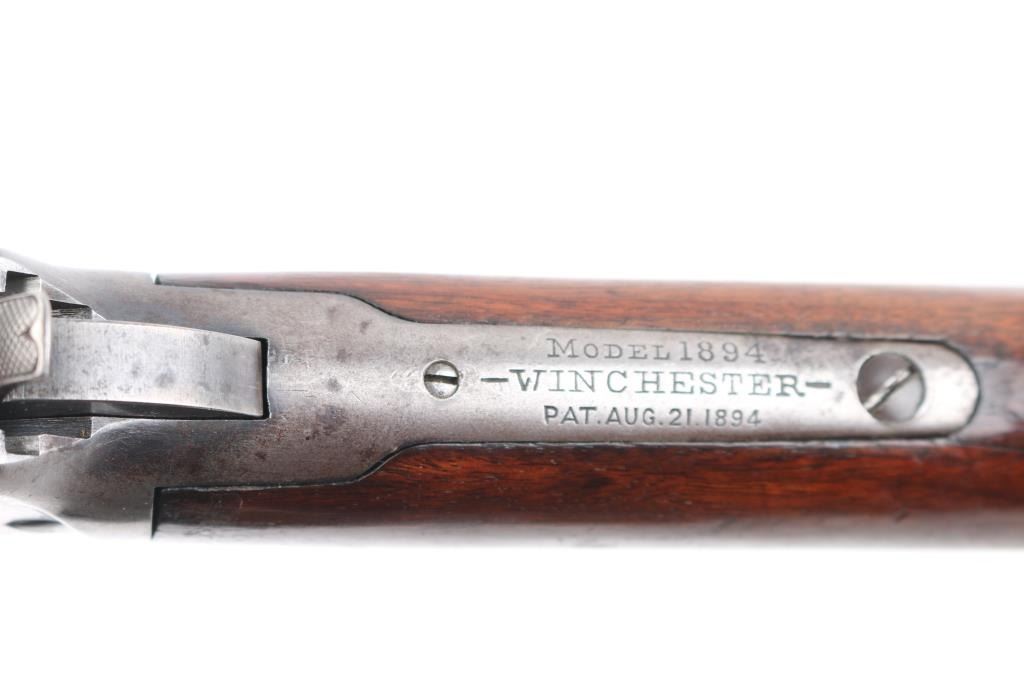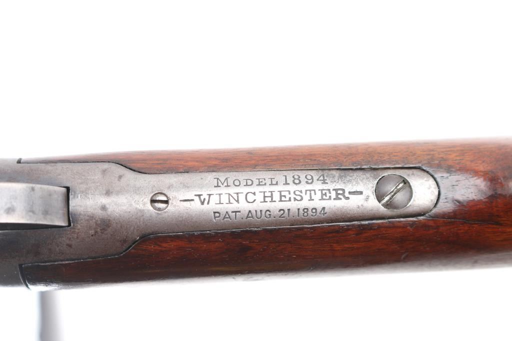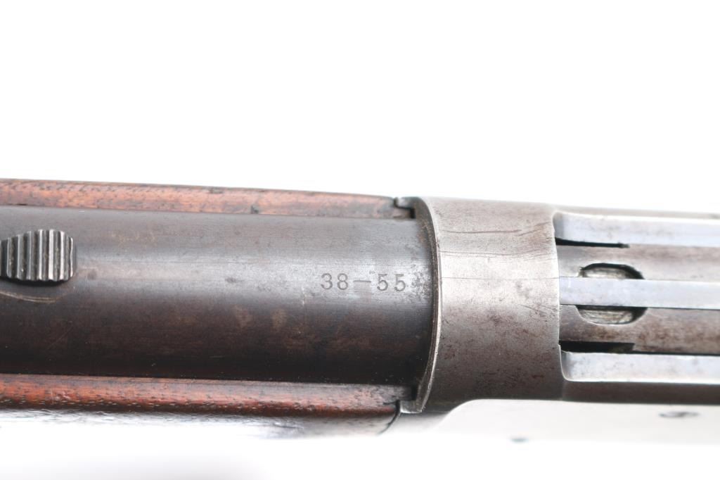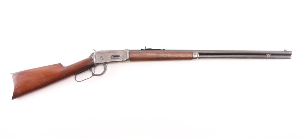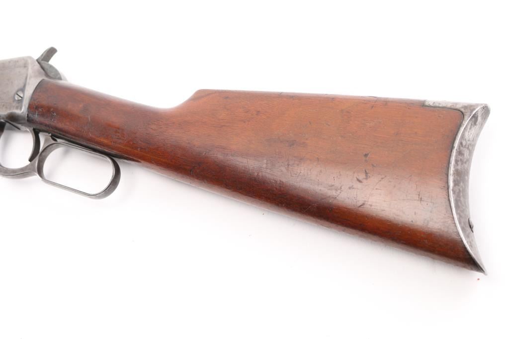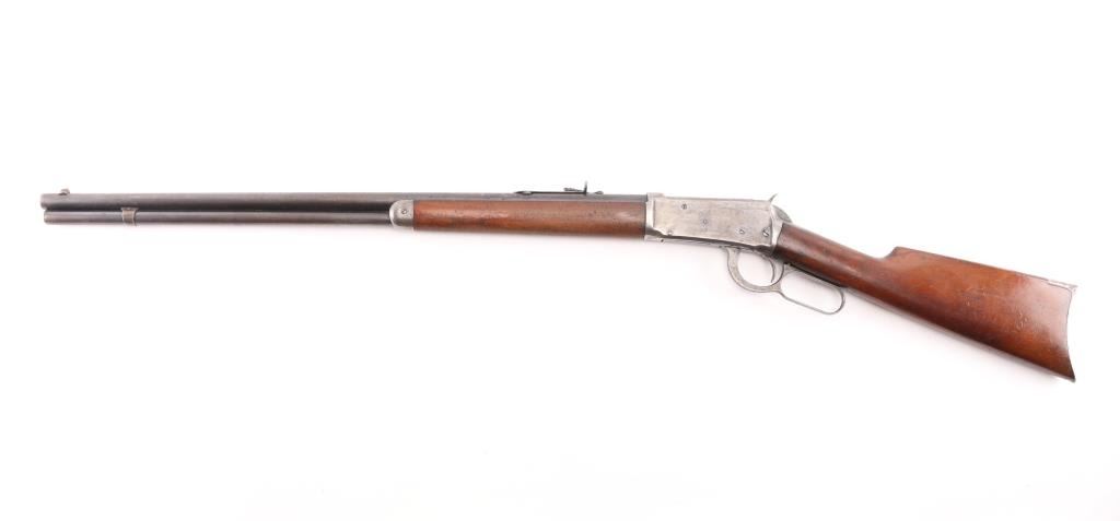 Antique lever action rifle manufactured circa 1897. Features 26" round barrel, full length magazine tube, dovetailed blade front sight, sporting rear sight, smooth walnut forend & straight wristed buttstock, steel crescent buttplate. Bore is fair condition, lightly pitted throughout, grayish color with strong rifling. Barrel and mag tube retain 60% bluing, mostly showing a dark finish color, fading to brown in many places, with areas of light patina, small bare spots, edge losses. Receiver is a dull silvery gray color, speckles of patina brown, with several deep scratches running along length of receiver sides. Buttplate is mottled brown patina color. Wood is good or better condition, shows oil staining in wrist area, loss or shrinkage at toe. A thin varnish was applies to wood at some point, now showing losses from handling. Condition is NRA Fine *** Antique Firearm ***