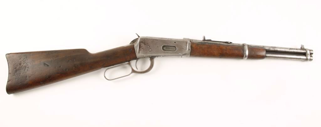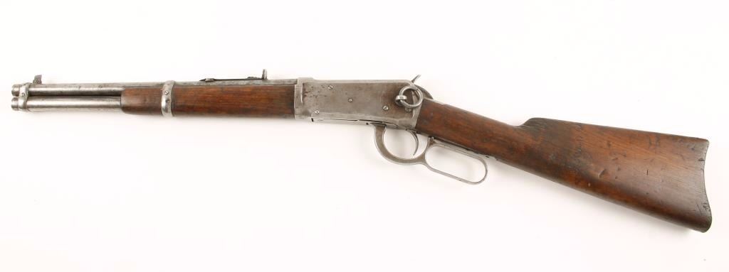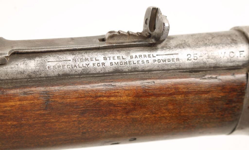 SN: 427187. *Non NFA Item* Well documented and significant one of a kind factory lever action short barreled rifle chambered in .25-35 Winchester Center Fire, circa 1906. Original short barreled rifle with a letter from the ATF denoting its classification as a class III firearm. Believed to be the only one ever produced by the factory. Features a 14" tapered barrel, full tube magazine, blade front sight, adjustable semi-buckhorn rear sight, two barrel bands, saddle ring, smooth trigger, checkered hammer spur, plain walnut forend and straight grip shoulder stock with metal carbine buttplate. Includes the original letter from the ATF as well as on official copy. Finish has moved to a light silver patina with areas of finish in protected areas and areas of light pitting on barrel. Wood stocks show many dings and mars but are full, have a very good fit and appear not to have been tampered with. Action is tight and bore shows good rifling.
