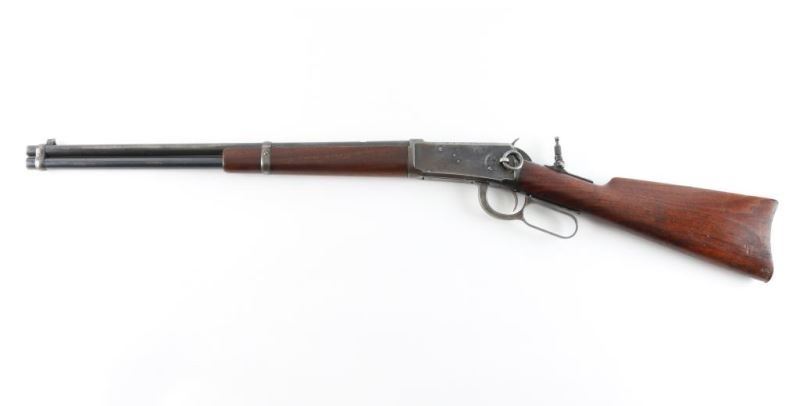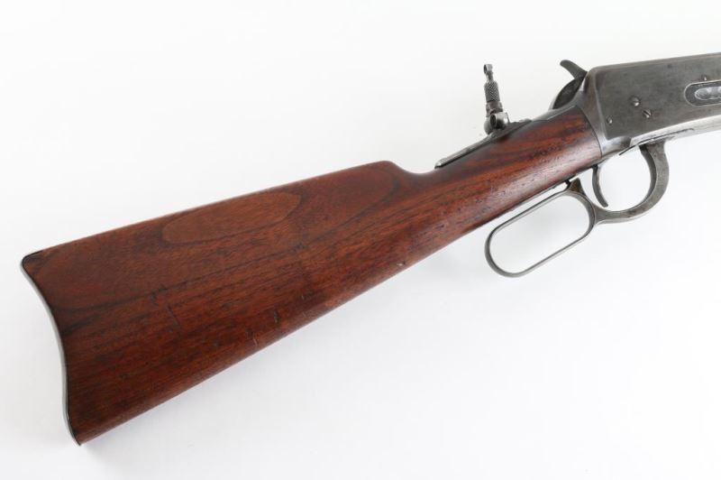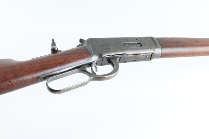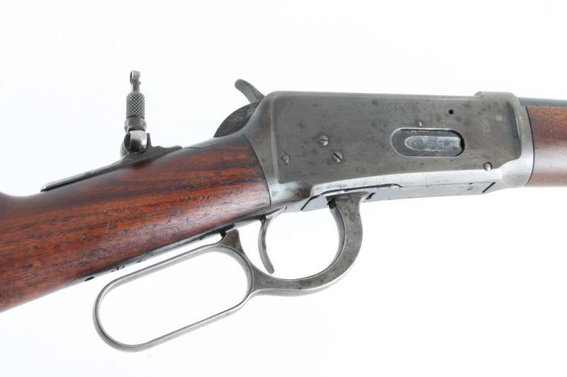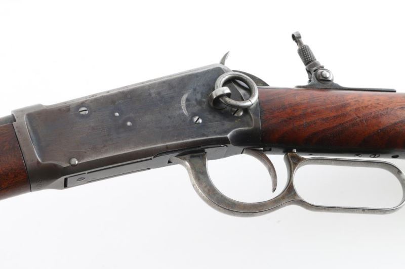 Vintage lever-Action Saddle ring Carbine manufactured circa 1897.Features blued finish, plain wood forend & straight gripped stock, steel semi crescent butt plate, 20" barrel, full length magazine tube, buckhorn sights, saddle ring on left side of receiver. Winchester barrel markings are clear. Bore is very good condition, with strong rifling, but a little dirty, Barrel and mag tube retain most of the bluing, with handling loss/rubs. Action is mostly silvery gray colored, with even shallow pinprick pits on the left. Blue mixing with gray patina on the right. Wood is in good condition, serviceable. Rear sight removed, flip up peep sight on tang. A really nice conditioned rifle for its age. Condition is NRA Good Antique Firearm.