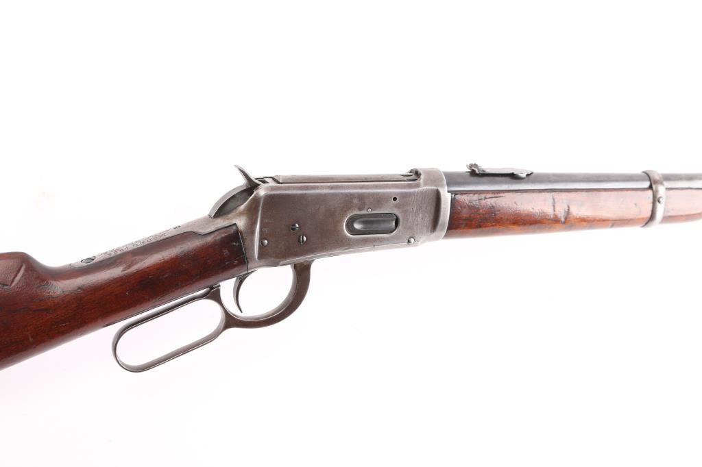 'Saddle Ring Carbine' Vintage lever action rifle manufactured circa 1906, chambered for 30-30 Winchester. Features 20" barrel, full length magazine tube, pinned brass blade front sight, flip notch rear sight, smooth walnut forend & straight wristed buttstock, carbine butt with curved steel buttplate. Bore is fair, good rifling, dark frosting in the grooves. Blue is about 40% mostly on the barrel/tube, receiver has turned a dark gray/brown patina with a series of scratches on both sides, "RTP" is stamped on both sides of the receiver. Wood is overall good/sound with many scratches/dings, some dents in the comb, stocks have been varnished.