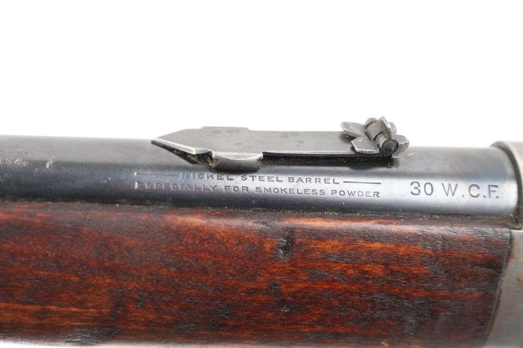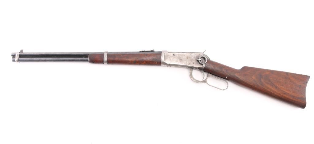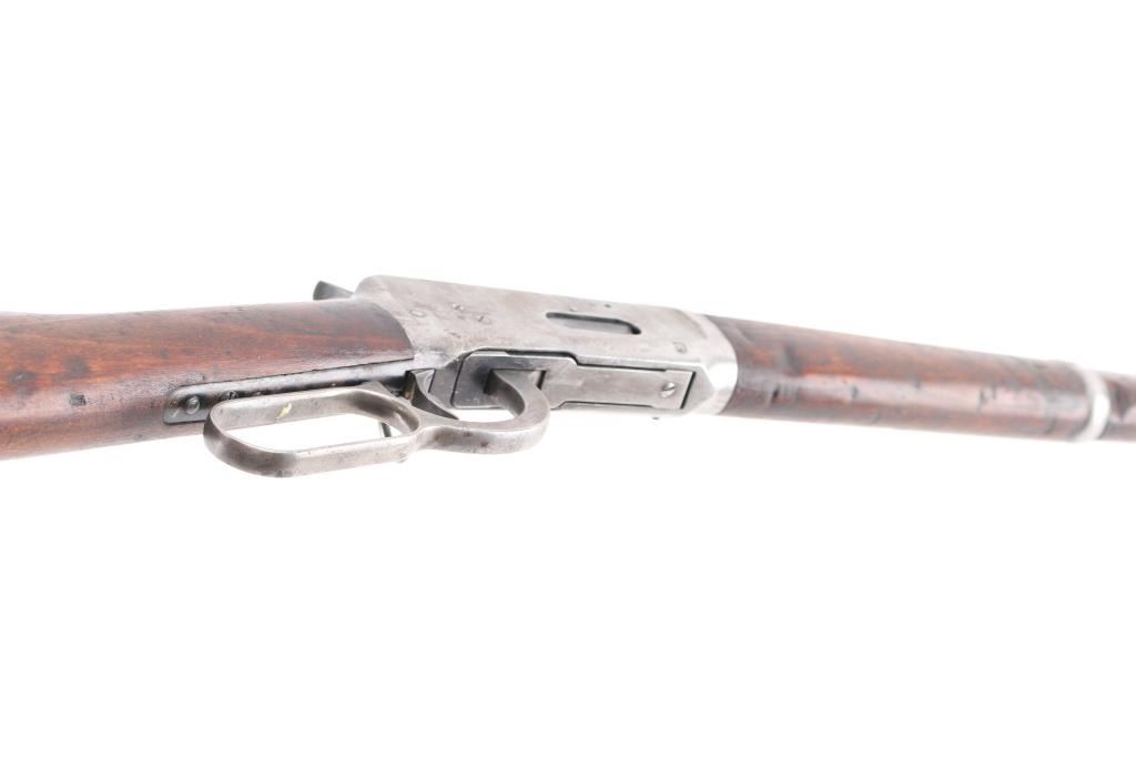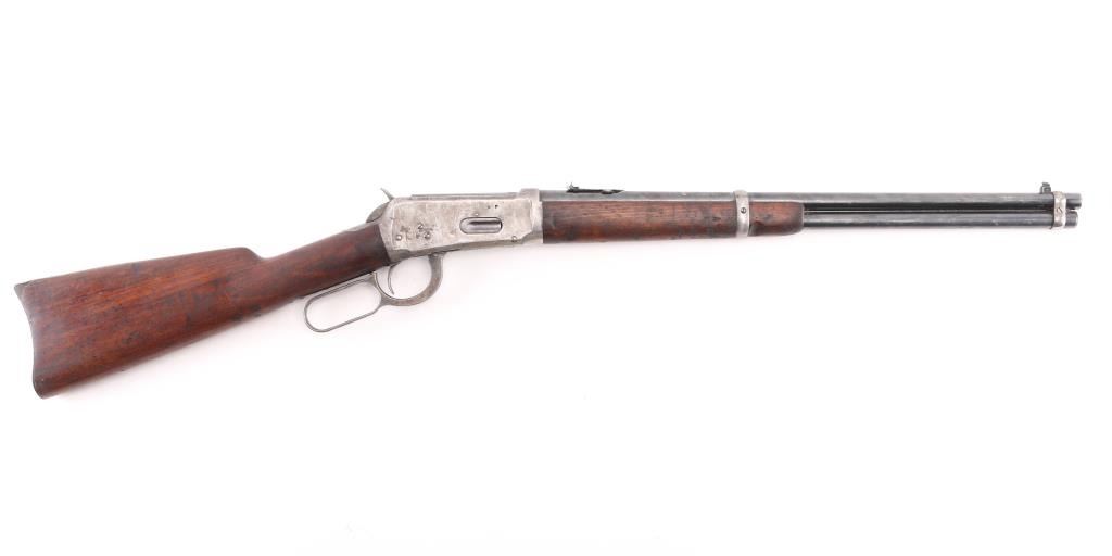 'Saddle Ring Carbine' Vintage lever action rifle manufactured circa 1910. Features 20" barrel, full length magazine tube, dovetailed blade front sight, notch rear sight with one folding leaf, one of the leafs is broken off, smooth walnut forend & straight wristed buttstock, carbine butt with curved steel buttplate. Bore is overall very good/bright, strong rifling, but has a dark ring about an inch below the muzzle.. Metal surfaces retain about 40% finish, most remaining dark bluing seen on the barrel, tube, & bolt, traces around the saddle ring. gray bare metal on majority of action. Wood is sound/good condition, has been re-finished at some point. Action is smooth/tight. All markings are crisp/clear. NRA Condition-Good. C&R Firearm.