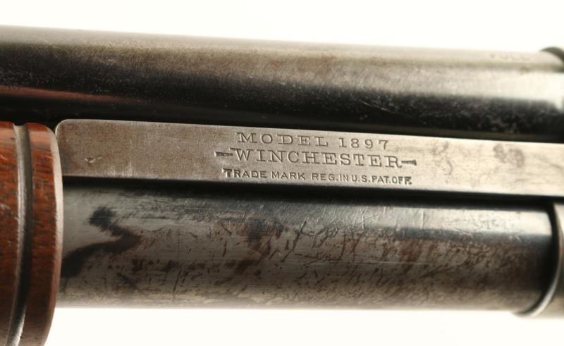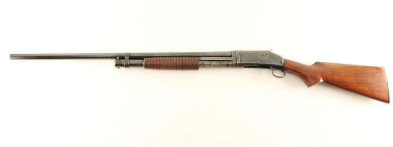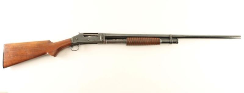Vintage take-down shotgun, circa 1910. Old reblued finish, 30" full choke barrel, brass beads front sight, 1/2 length tube magazine, steel receiver, smooth trigger, exposed hammer, grooved walnut slide handle and smooth pistol grip shoulder stock with replaced factory(likely reproduction) buttplate. Approximately 60% refinish intact with some old pitting under the finish on the receiver, handling wear, edge wear and some scattered light surface rust. Markings are decent, action is smooth, bore is bright with some pitting and wood stocks are good+ with a 3.5" crack on the right side of the slide handle. Condition is near good. ***C&R Firearm***
