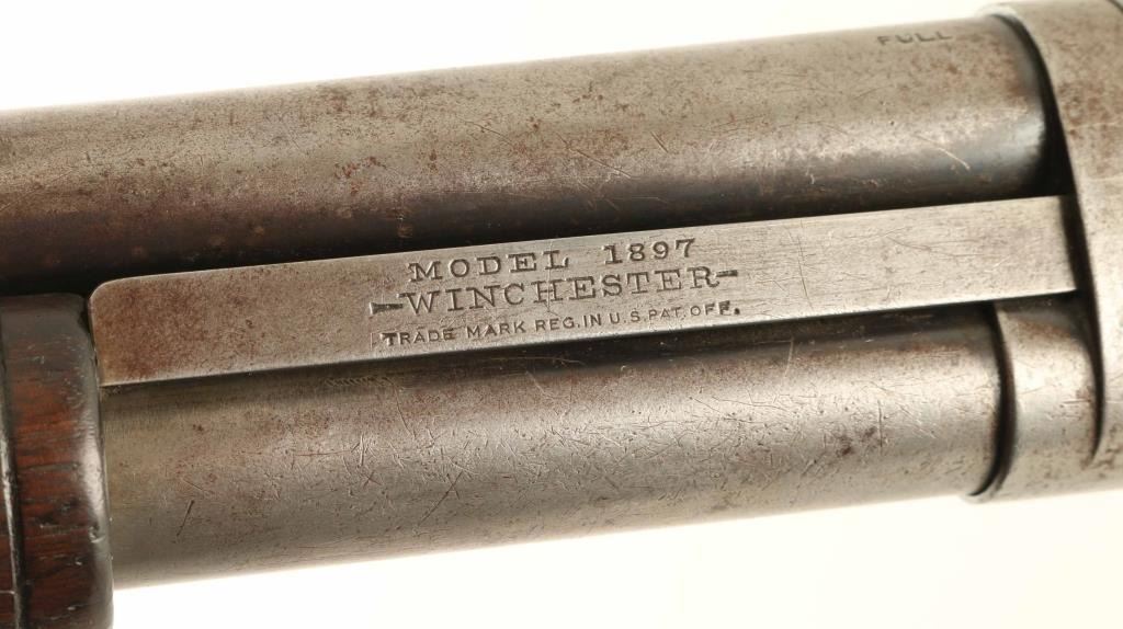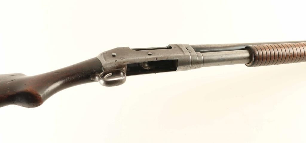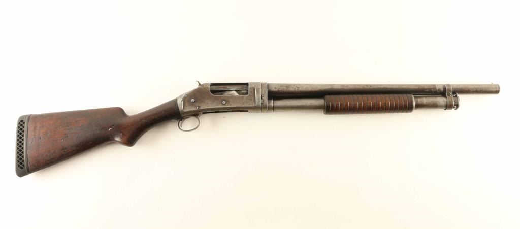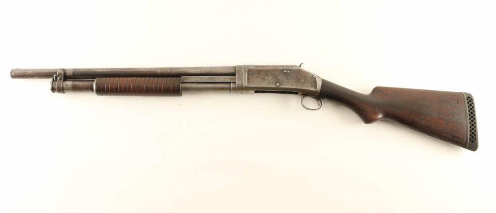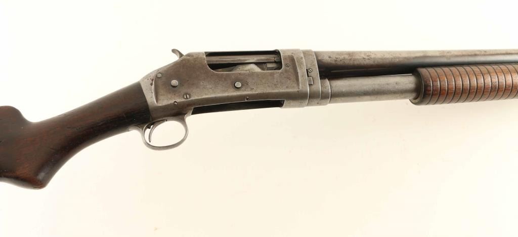 Vintage take-down slide-action repeating shotgun chambered for 2 3/4" 12 gauge shells, manufactured in New Haven, CT circa 1911. Features a blued finish, cut-down 19 5/8" barrel, brass bead front sight, 5 round tube magazine, smooth trigger, exposed hammer with knurled spur, single action bar, grooved walnut slide handle and smooth semi-pistol grip shoulder stock with White Line recoil pad & 13 3/8” LOP. Matching serial numbers are found on the receiver and takedown extension. Shotgun shows age with bluing retained only in the protected areas and the vast majority of the metal surfaces bearing a mottled grey/brown patina. The magazine band is a bit loose and can slide out of position, although not easily; the band screws appear snug - repair or parts replacement possibly required to get the band tight. Action is sound, the bore has good luster with scattered light pitting, the markings are good and the walnut stocks are near good with blemishes & wear.