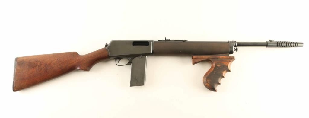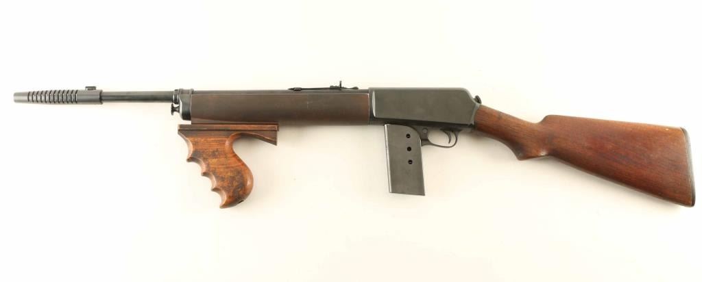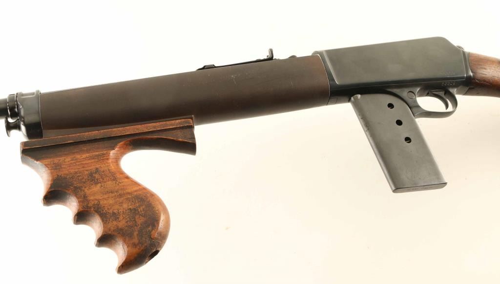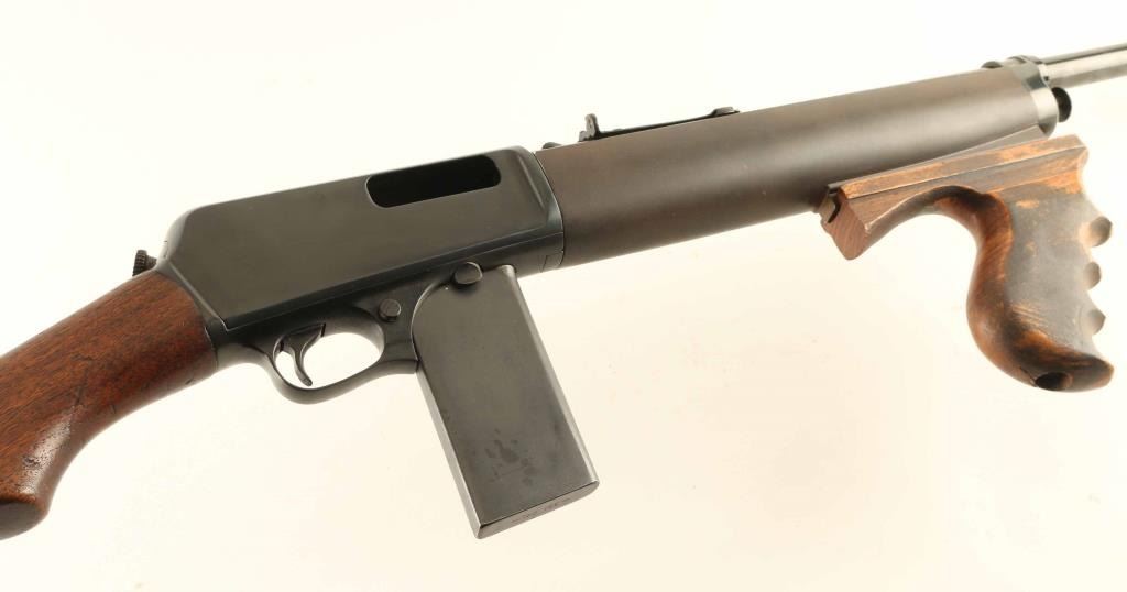 Semiautomatic replica of guns made by Hyman Lebman of San Antonio for the Dillinger Gang. This rifle was originally manufactured circa 1916. Features a blued finish, 16" round barrel, Cutts compensator style muzzle brake increases barrel length to 20.5", dovetailed blade front sight with brass bead, semi-buckhorn adjustable rear sporting sight, accepts detachable magazines, take-down receiver, cocking button in front of forend (rotates to act as bolt hold open), smooth trigger, push button safety, custom aluminum forend with Thompson forward pistol grip, pistol grip shoulder stock with serrated composition buttplate. Serial numbers match on both parts of the receiver. Bore is very good condition. Retains 98% re-blue, with handling marks. Forend & forward grip are very good to excellent. Butt is very good condition with scratches and a few small gouges. Buttplate is good condition. Includes (1) 10 round magazine, appears original, cleaned & reblued. Safety button does not click into position, appears that detent inside needs attention. Condition is NRA Very Good++ (as rebuilt / modified) *** C&R Firearm ***