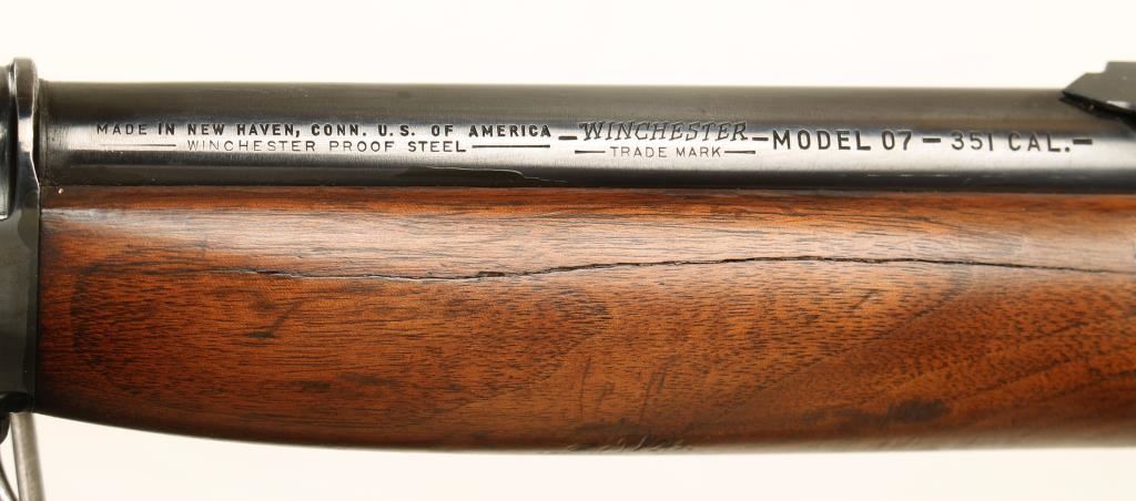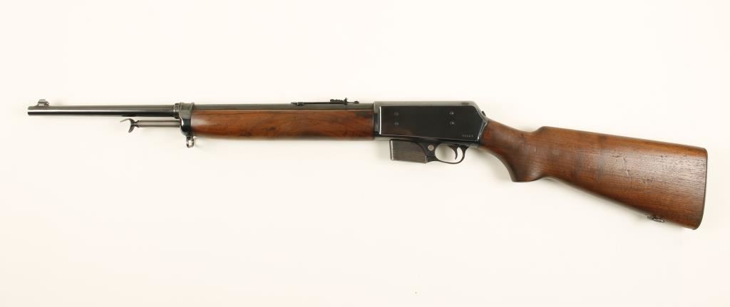 Re-blued semi-automatic take-down rifle with a 19-7/8" barrel and one magazine. Metal finish has light edge wear and scratches. Wood has shallow dings and dents and one crack running 2/3 of the length of the forearm. Bore is shiny with light rifling. Action works well. Condition is good to very good. *Modern Firearm*