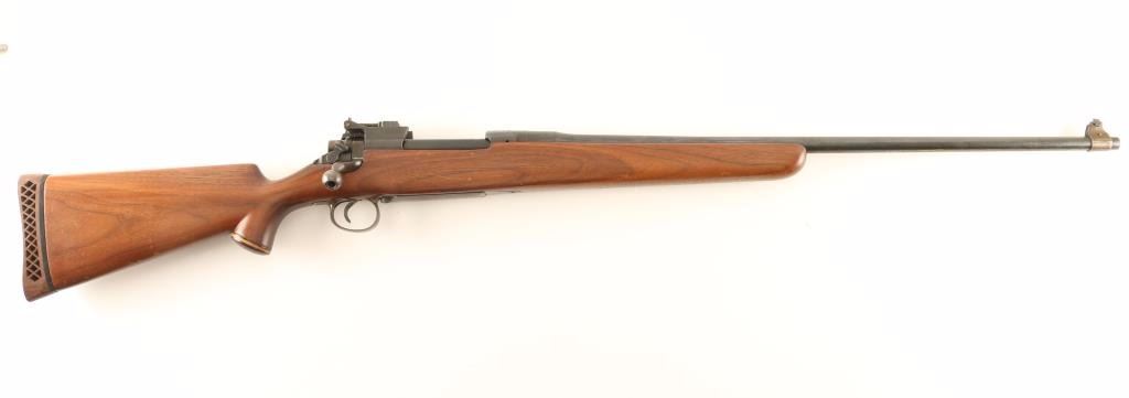Sporterized U.S. Military contracted bolt action service rifle chambered in .30-06 Springfield, circa 1918. Features blued refinish, 26" barrel marked "W/[flaming bomb]/8-18", dovetailed patridge front sight, adjustable flip-up rear aperture sight, 6 round integral box magazine, serrated trigger, trapdoor metal buttplate, manual safety, bent bolt handle, and custom pistol grip shoulder stock with grip cap, right handed cheek rest & Browning recoil pad. Rifle retains approximately 70% of it's blued finish showing heavy wear on the floorplate & triggerguard, moderate wear on the bolt and light wear, scattered scratches, adhesive residue & few spots of light surface rust on the barrel/receiver. Action is strong, bore is semi-dark with good rifling and wood stock is good to very good with scattered small blemishes. Condition is good as sporterized. ***C&R Firearm*** ***Modern Firearm***