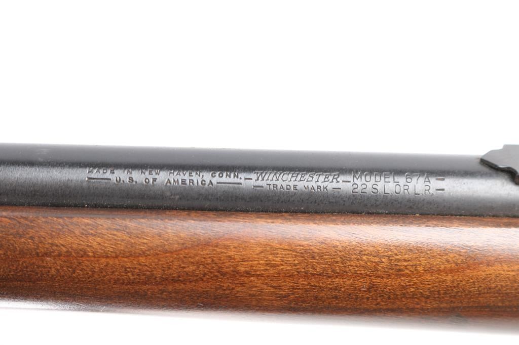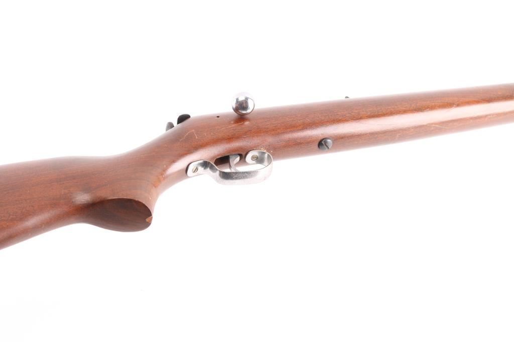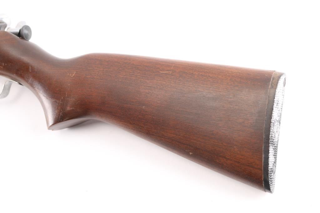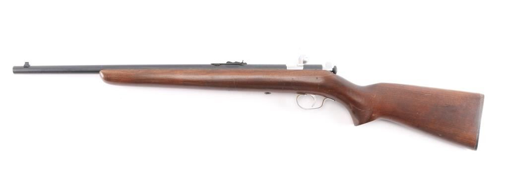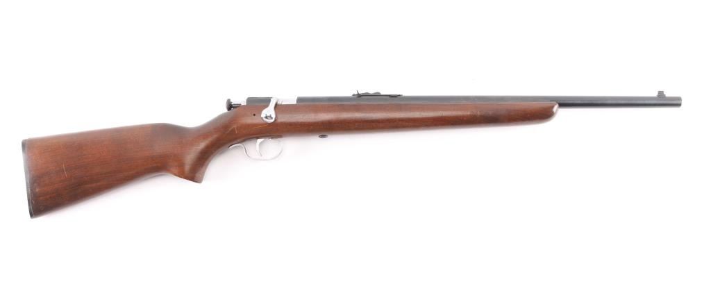 Single shot bolt action "Youth Rifle" manufactured between 1938 and 1963, with New Haven address. Features blued finish, chromed bolt, approx 20" barrel (34-5/8" overall length), sporting sights, must be manually cocked for each shot, safety at rear of bolt, original Winchester buttplate, smooth walnut stock. Bright bore. Very good plus with most original finish. Some light storage rust near muzzle that should clean. Shows a few light marks to stock.