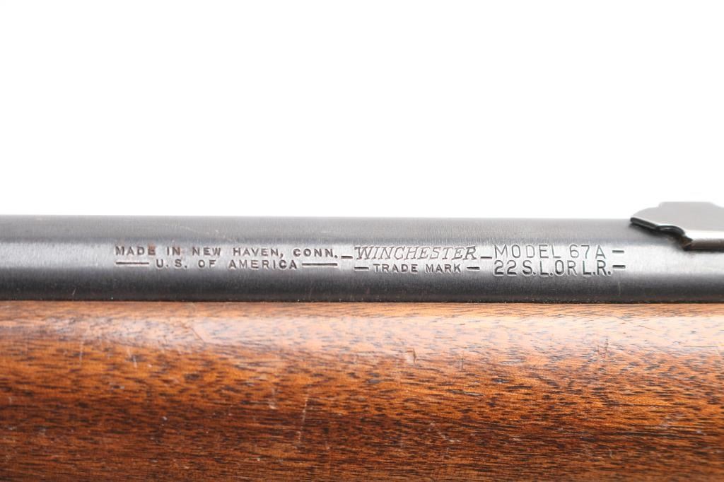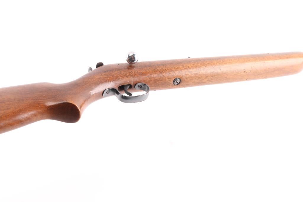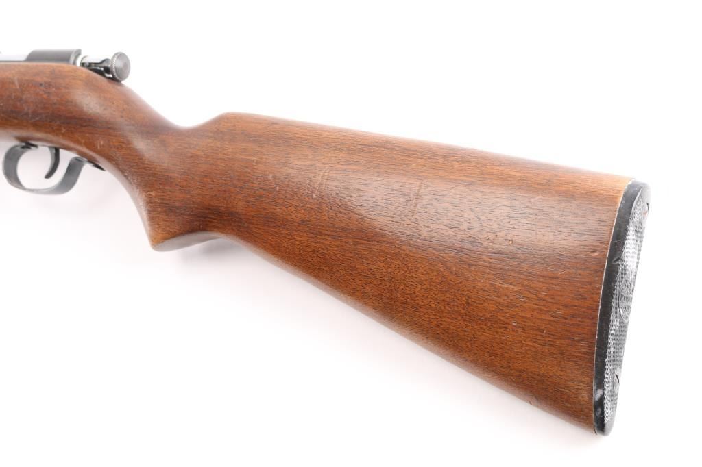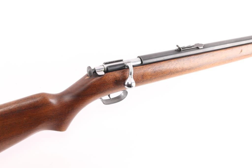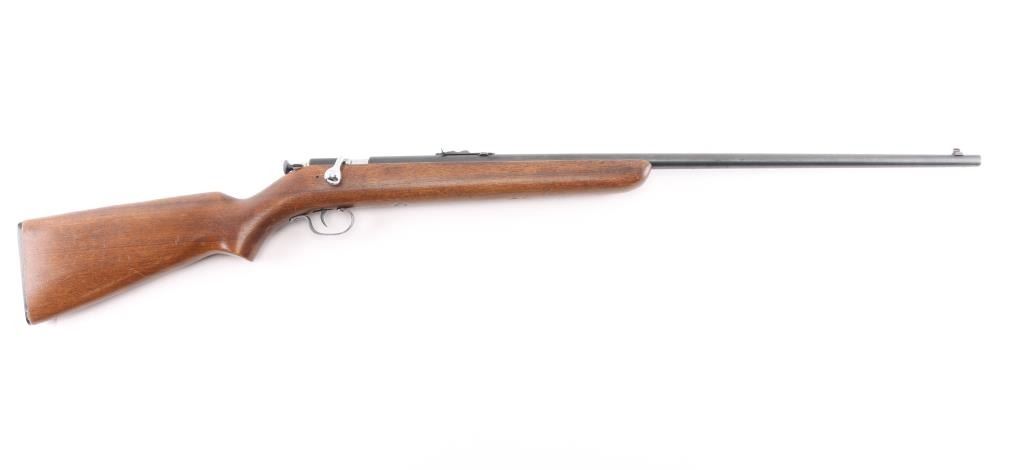 Single shot bolt action "Youth Rifle" manufactured between 1938 and 1963, with New Haven address. Features blued finish, chromed bolt, approx 27" barrel , sporting sights, must be manually cocked for each shot, safety at rear of bolt, original Winchester buttplate, smooth walnut stock. Bore is very good/bright. Most original finish with 3 areas of storage rust/pitting on the underside of the upper barrel. Stock is sound with some minor scratches/dings.