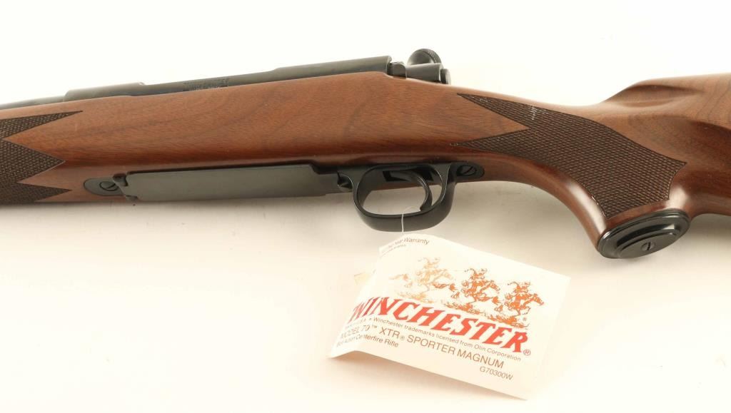 Sn: G1829045 Winchester Model 70 XTR Sporter bolt action rifle, chambered in 300 Weatherby Magnum. Hinged floor plate, jeweled bolt, checkered walnut stock with cheek piece and rubber Winchester recoil pad. 24" barrel with 13 1/2" LOP. Blued barrel and receiver 95+% wood is very good no marks, scuffs, dents or dings. Circa 1986-87. Condition is NRA Excellent *** Modern Firearm ***
