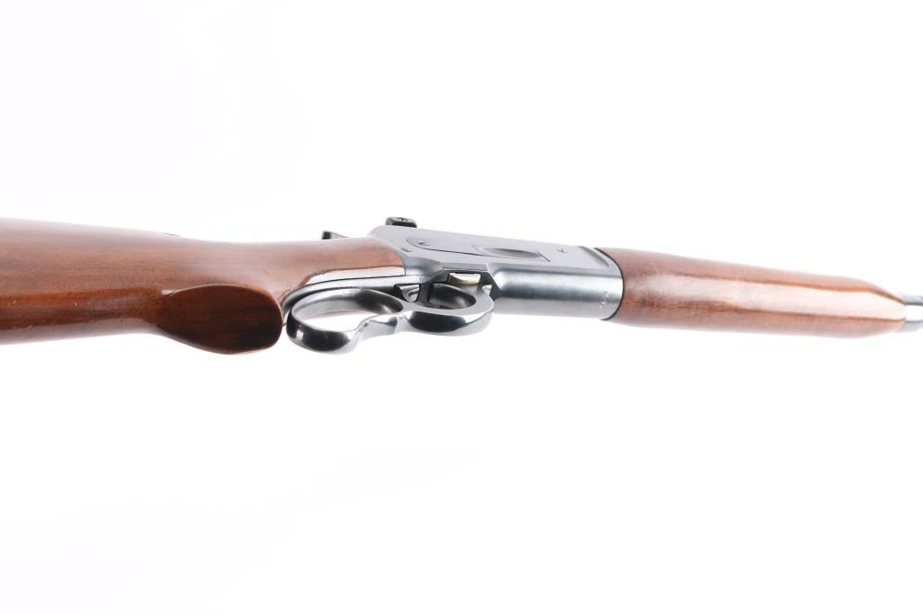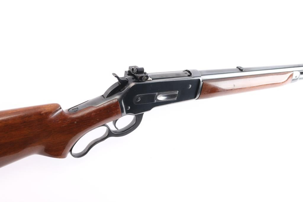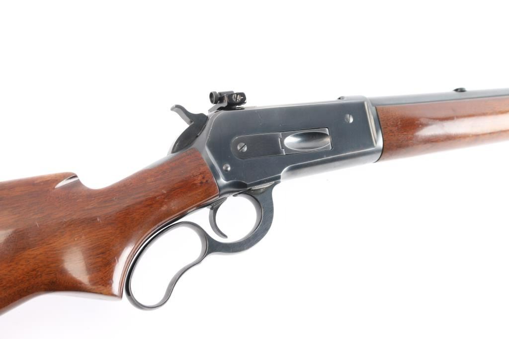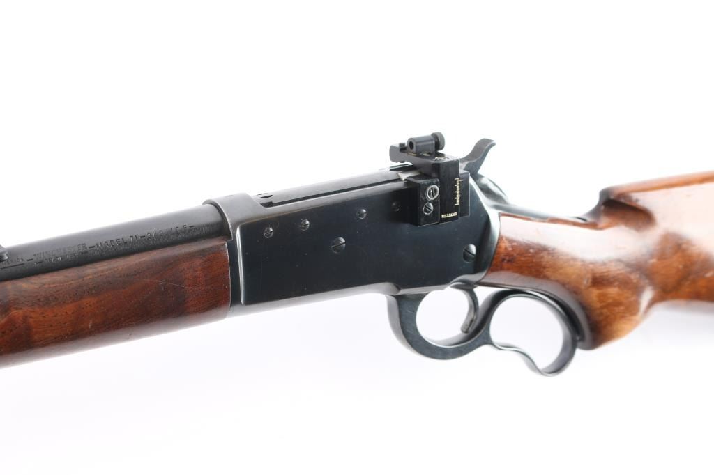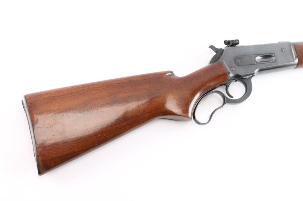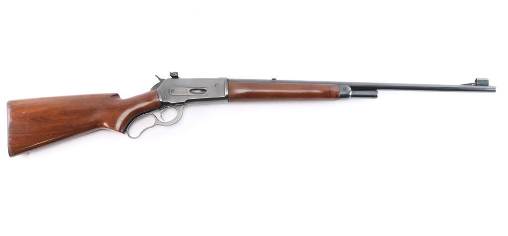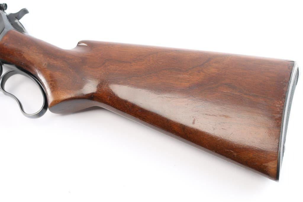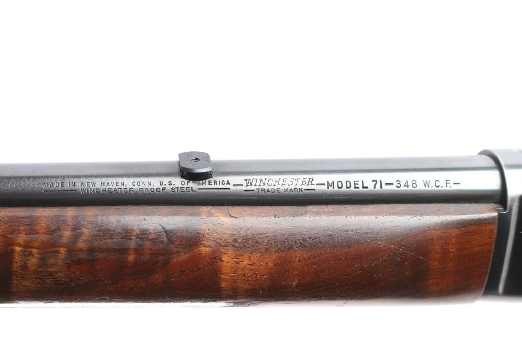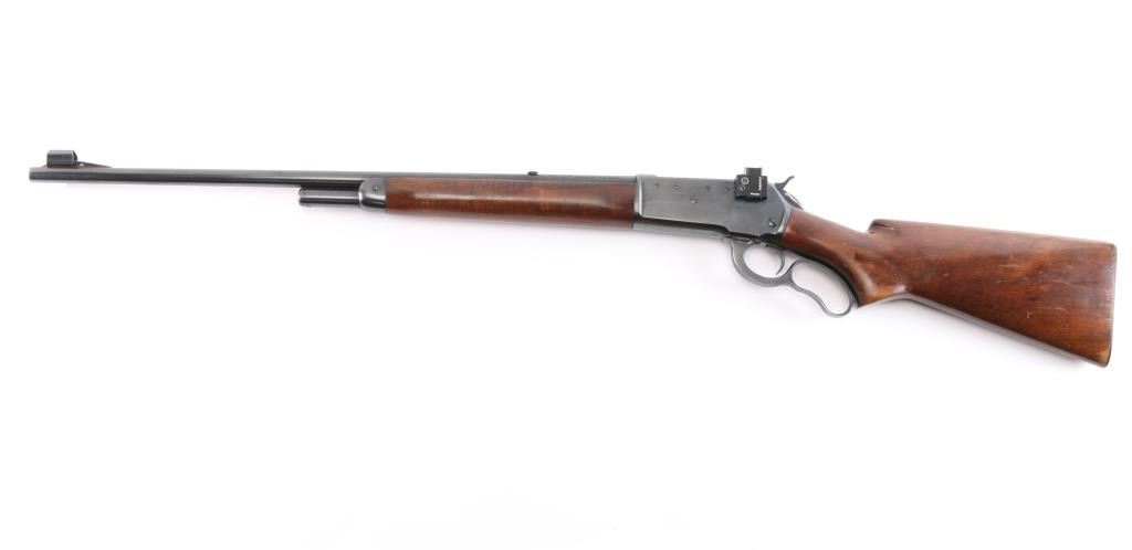 Big Bore lever action rifle manufactured circa 1951, chambered in 348 Winchester. Features blued finish, smooth walnut furniture, curved wrist & lever, checkered steel buttplate, 24" barrel, half length mag tube, hooded blade front sight, rear sight dovetail filled with blank, Williams receiver mounted peep rear sight. Bore is bright. Retains 95% re-blue with losses to a few contours, some dishing around edges. Wood is very good with varnished finish.