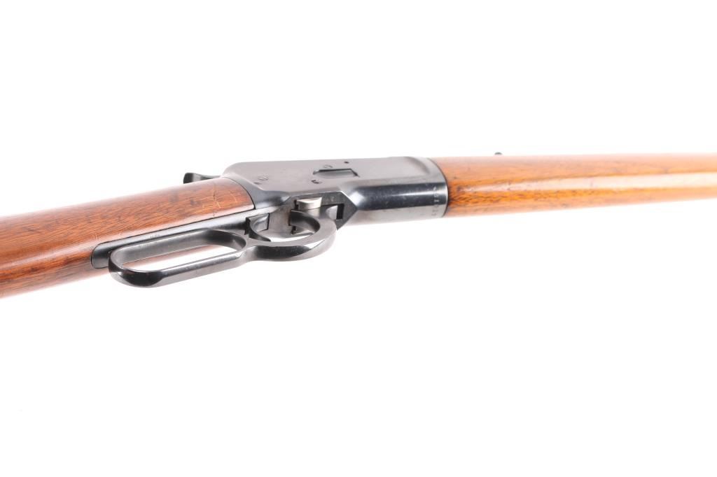 Vintage lever action repeating rifle chambered in .25-20 W.C.F. Manufactured circa 1909. Features a blued finish, 24 1/4" round barrel, full length tube magazine, dovetailed blade front sight with brass bead, adjustable rear sporting sight, smooth trigger, knurled hammer spur, smooth walnut forend with metal cap and a straight grip shoulder stock with crescent metal buttplate. Bore is in very good condition, strong rifling, slightly dirty. Refinished, retaining 80% bluing, mostly on barrel and receiver. Receiver shows pitting with edge wear and loss of finish on magazine tube. Wood is good with some dents and scratches. Action is smooth. Markings are sharp.