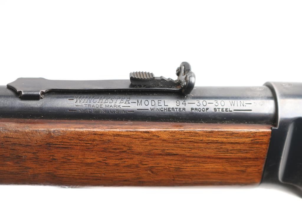 'Pre-64, Eastern Carbine' Vintage lever action repeating rifle chambered in .30-30 Winchester, manufactured circa 1961. Features a blued finish, 20" tapered barrel. full-length tube magazine, ramped blade front sight with bead top, adjustable rear sporting sight, smooth trigger, serrated hammer spur, grip safety, factory drilled & tapped receiver for a side mounted sight, two barrel bands, smooth walnut forend and straight grip shoulder stock with knurled metal buttplate. Rifle exhibits approximately 85% of it's original blued finish, with edge/muzzle wear, handling wear, mostly on the bottom of receiver, a couple of rubs on the lower barrel. Action is smooth, the bore is excellent and the wood stocks are very good with a few minor scratches/scuffs.