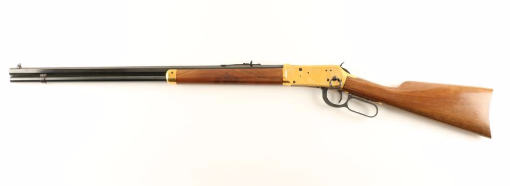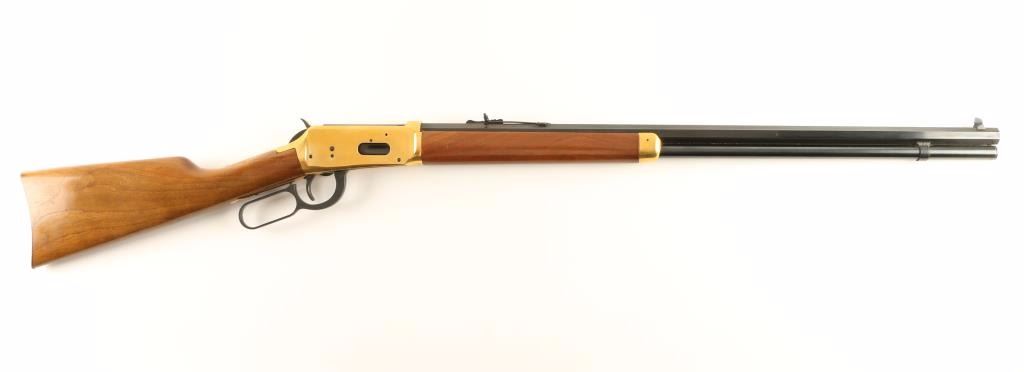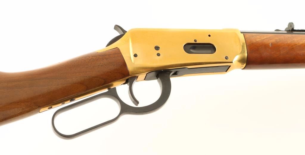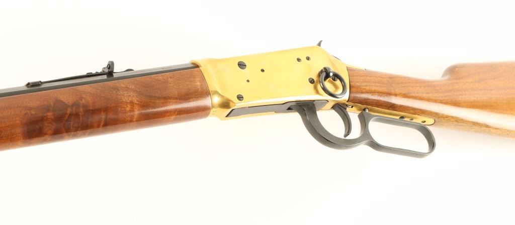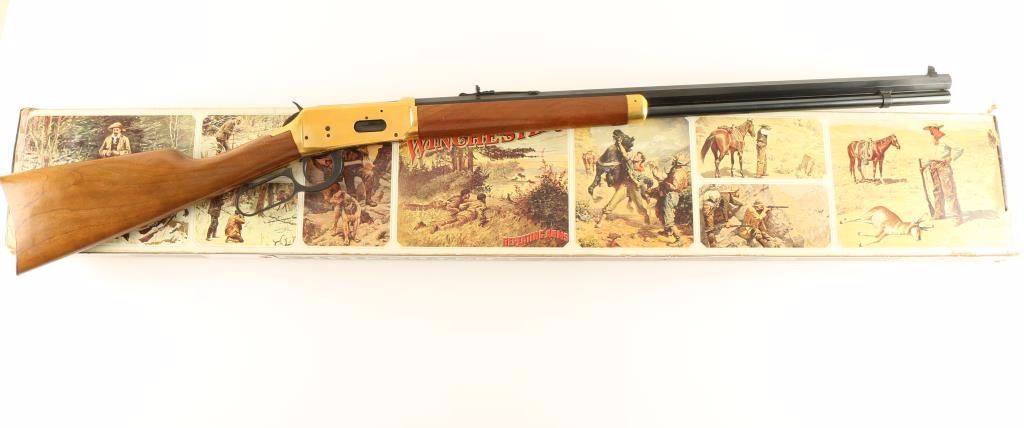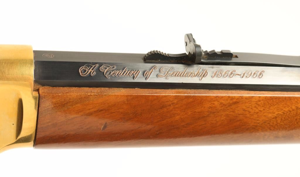 'Centennial '66' Lever action commemorative repeating rifle chambered in .30-30 Winchester, circa 1966. One of only 102,309 produced, inscribed "A Century of Leadership 1866-1966" on barrel. Features a blued 26" octagonal barrel, full tube magazine, blade front sight, adjustable rear sporting sight, brass colored receiver, serrated hammer spur, beveled trigger, saddle ring, smooth wood forend with metal tip, and straight grip shoulder stock with metal buttplate. Includes original factory cardboard box with sleeve, documents and tissue paper. Finish shows some handling wear and small losses the brass finish on receiver. Rifle also exhibits an orange powdery substance in many small crevices, possible surface rust. Action is smooth, bore is pristine and wood stocks are fine. Condition is near excellent. ***C&R Firearm*** ***Modern Firearm***