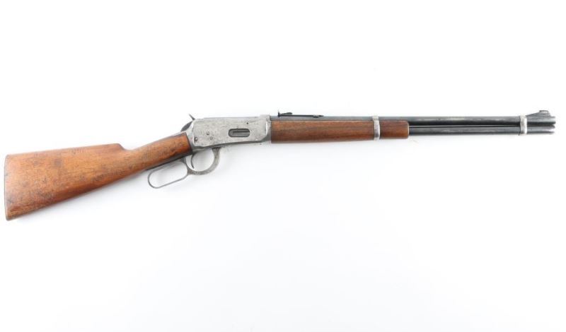Rifle. Lever. Vintage rifle manufactured 1938. 20" barrel with full length tube magazine (7 rds) Ramped post/bead front, semi-buckhorn rear sights. Straight walnut stock, forearm. Serrated steel buttplate. Standard Winchester markings on barrel, and tang. Winchester proof. Action is smooth/tight.. Bore appears very good/bright. Blued finish is about 40% with blue remaining on the barrel/magazine. Receiver, lever, barrel bands, and buttplate are in the white, with pitting. Wood is ok with scratches/dings. NRA condition-Fair C&R Firearm.