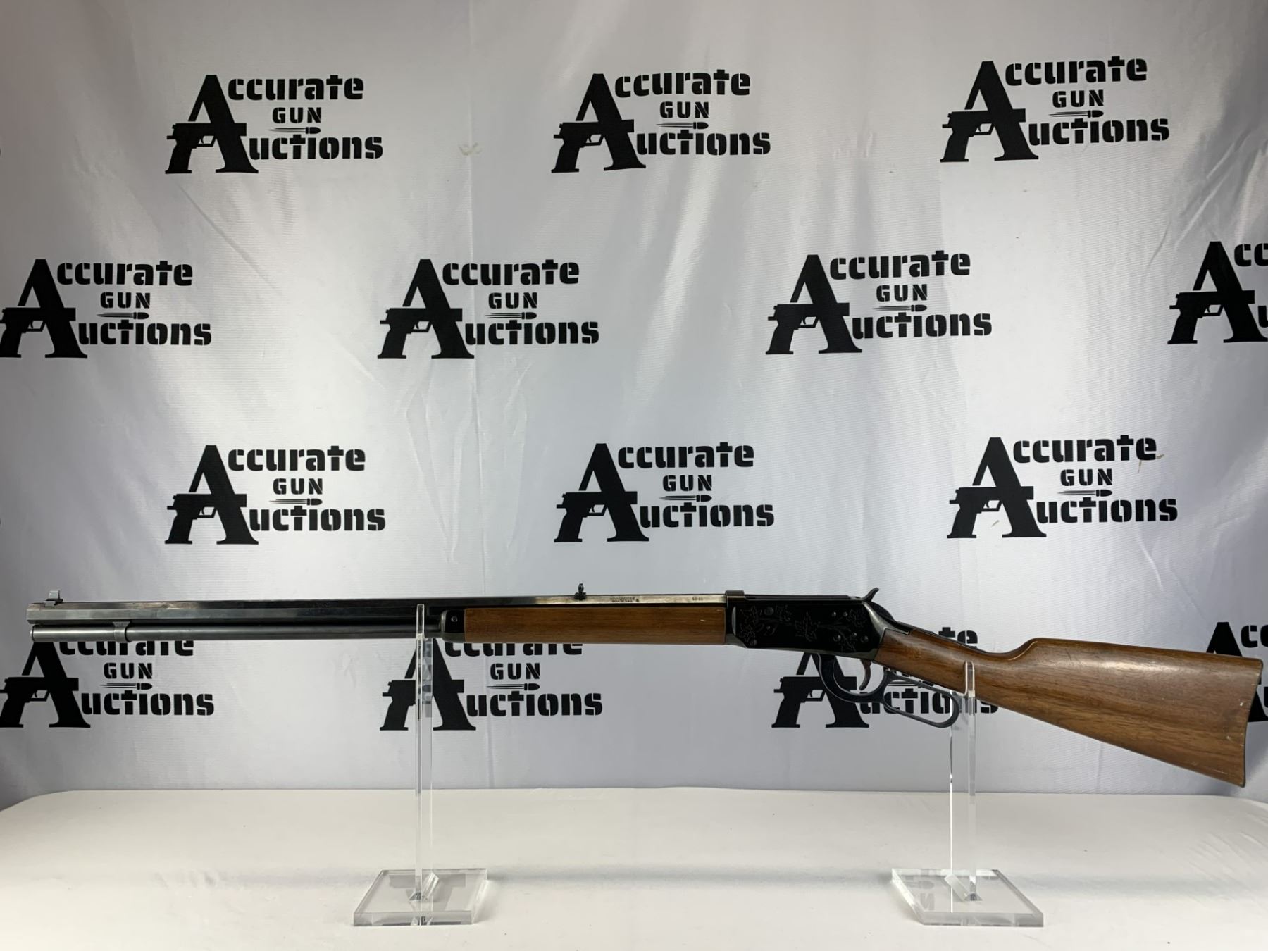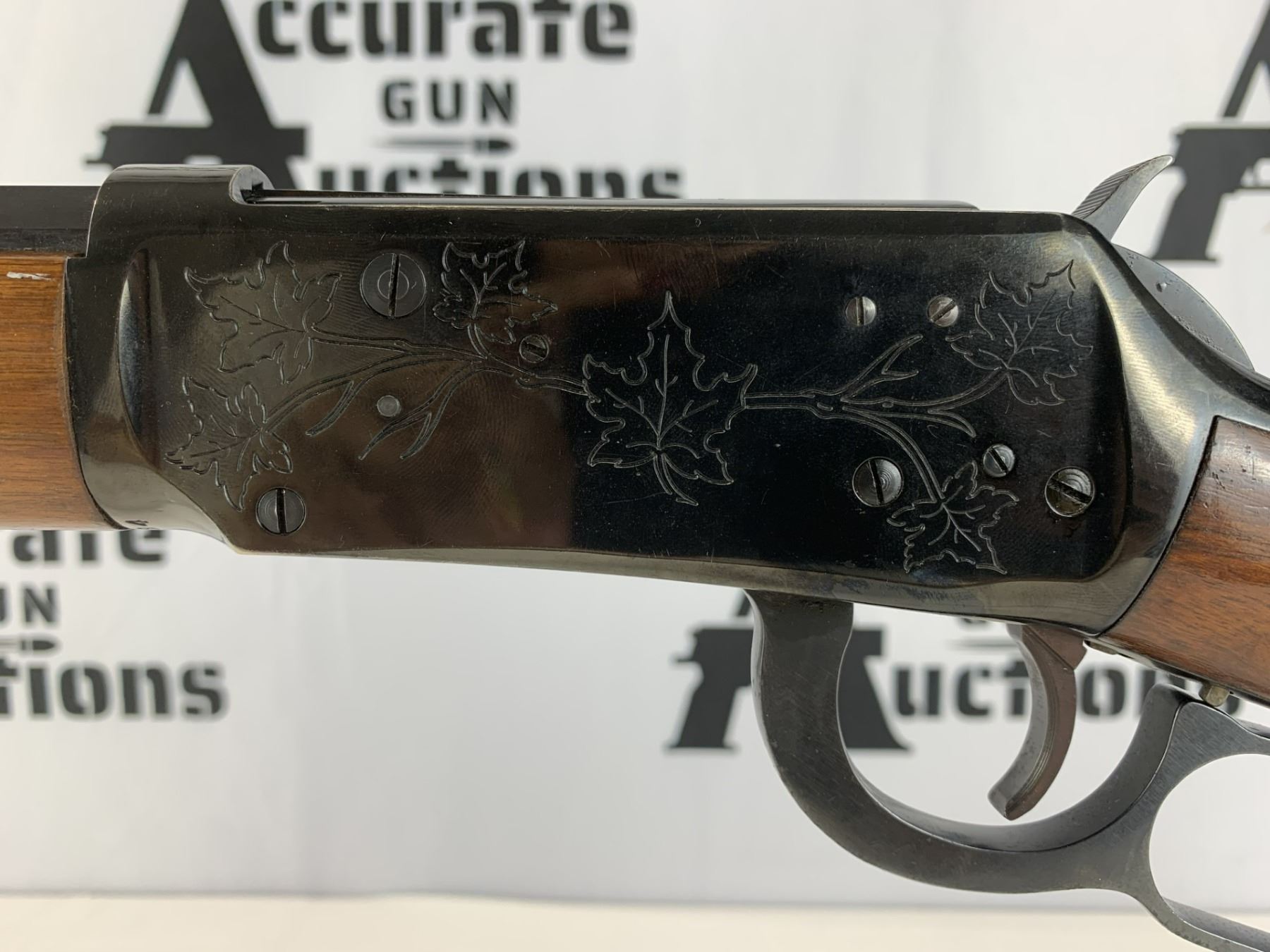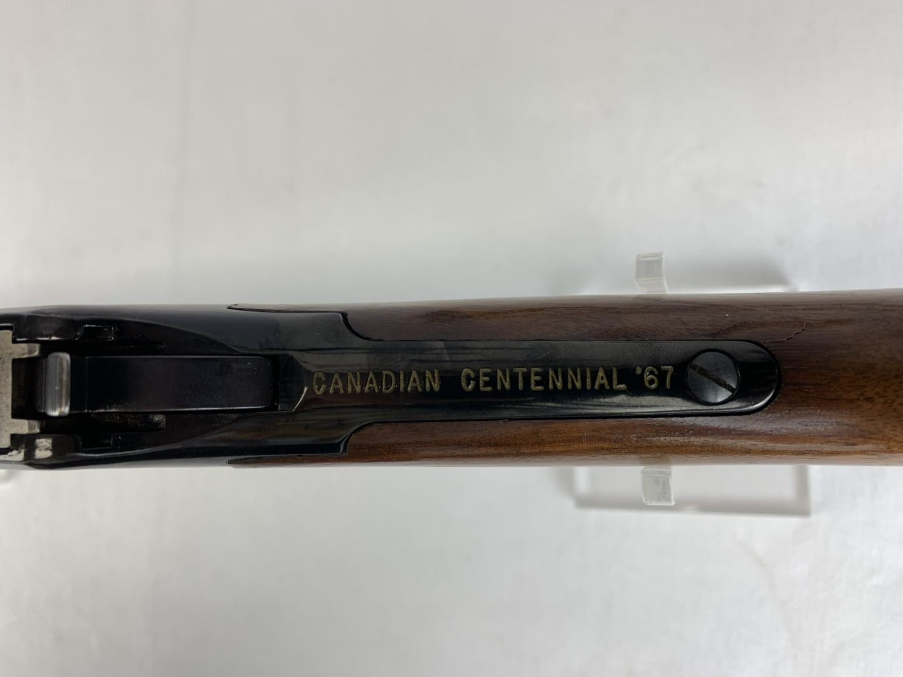 With an overall length of 44.5", this Canadian Centennial (1867-1967) has custom flower engravings on both sides of the receiver and an octagon barrel. All markings are still highly visible, has a static front