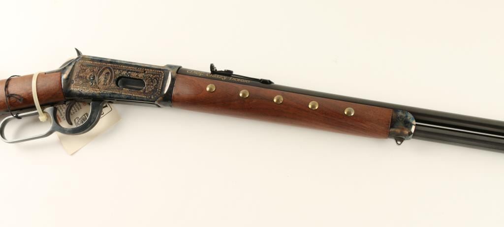 Winchester 94 Chief Crazy Horse SRC Rifle, .38-55 cal., 24” round barrel, blue finish with case colored frame and fore end cap, wood stock with brass tack decoration and medallion on the right side of the butt stock, S/N CCH16213. This rifleremains in like new condition showing little to no use. The stock remains in excellent condition showing light scratches. The action is crisp and the bore is excellent. Included is its original styrofoam insert and sleeve with damage to theends. (C&R). Est.: $400-$800