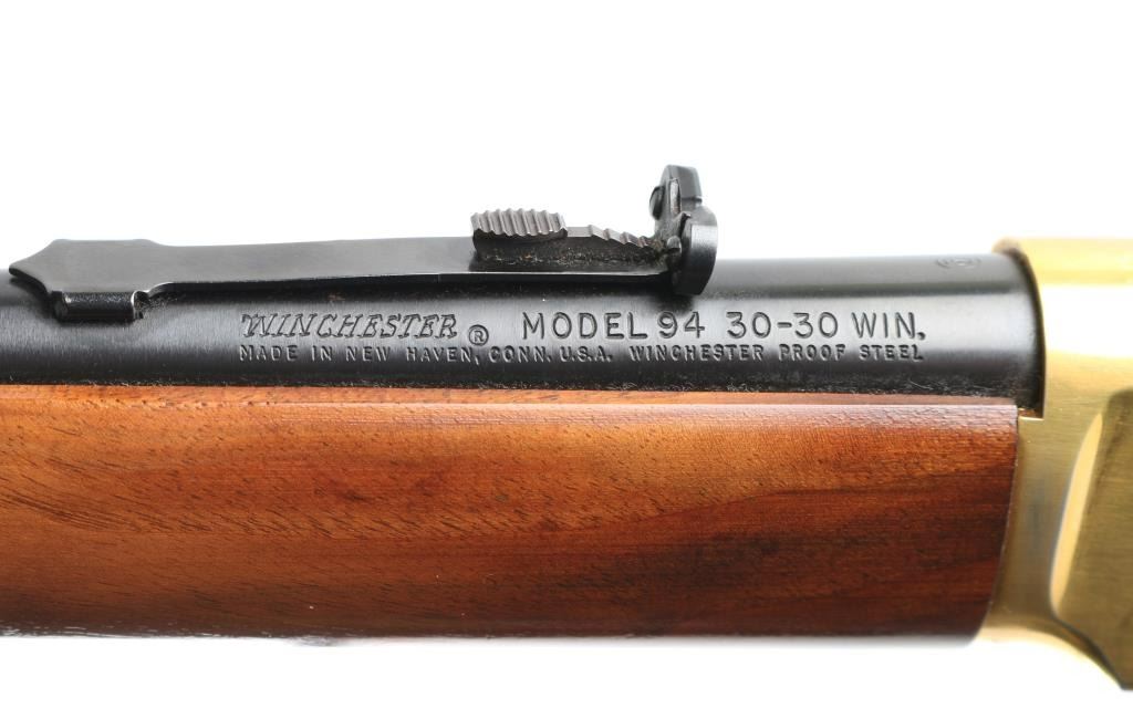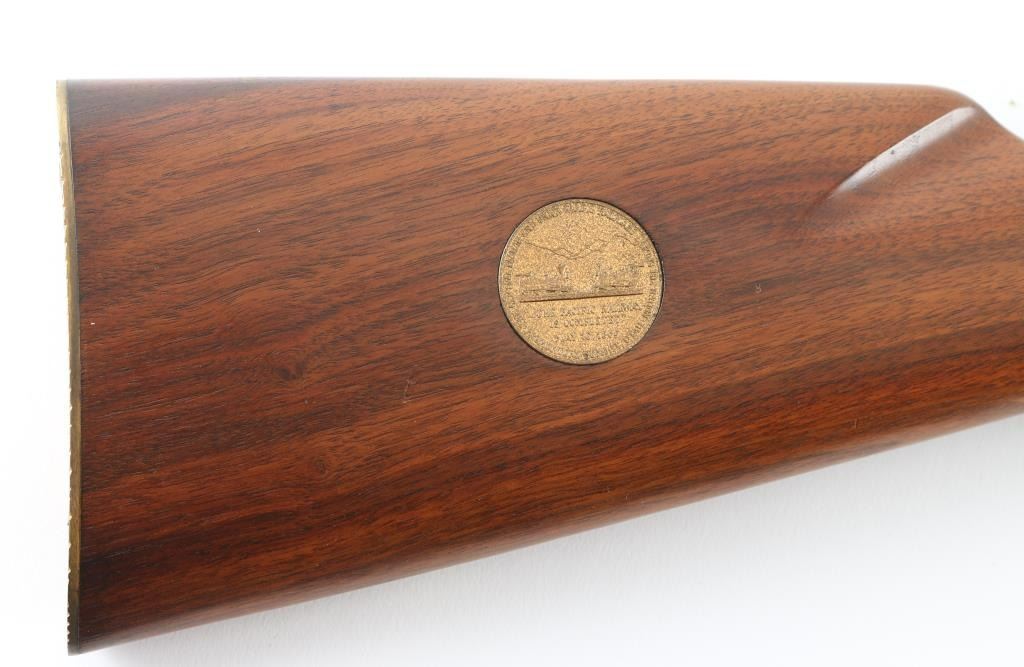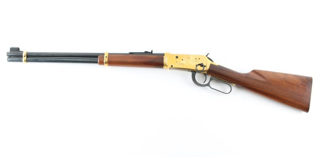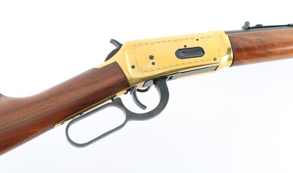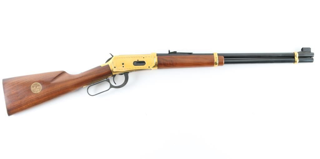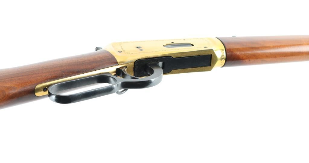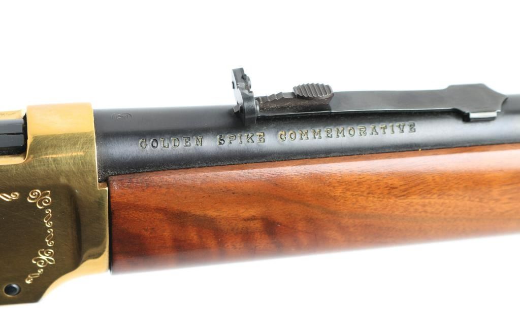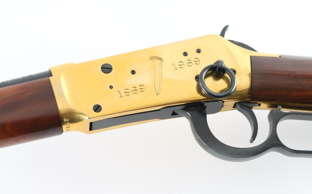 SN: GS50157 Commemorative lever action repeating rifle celebrating the completion of a rail line spanning the North American continent on May 10th,1869 at Promontory Summit Utah. Manufactured circa 1969 with just under 70,000 reported to have been produced. Features a blued (barrel, magazine tube, bolt, lever, trigger, hammer) & gold washed (receiver, bands, buttplate) finish, light coverage roll stamp engraving on the receiver, 20" tapered barrel, full-length tube magazine, ramped & hooded blade front sight, elevation adjustable rear sporting sight, smooth trigger with beveled edges, serrated hammer spur, grip safety, saddle ring, two barrel bands, smooth fancy figured walnut forend and straight grip shoulder stock with inlayed coin (depicting two trains meeting as the line was finally completed) on the right side & knurled metal buttplate. Right side of receiver engraved with border scroll, left side with "1869 (image of railroad spike) 1969". Upper tang bears the inscription 'Oceans United by Rail'. Rifle retains approximately 95% of its original finish showing scattered handling marks/scratches. Action is smooth, the bore is pristine and the wood stocks are fine with minor blemishes. Condition is near NRA Excellent *** C&R Firearm ***