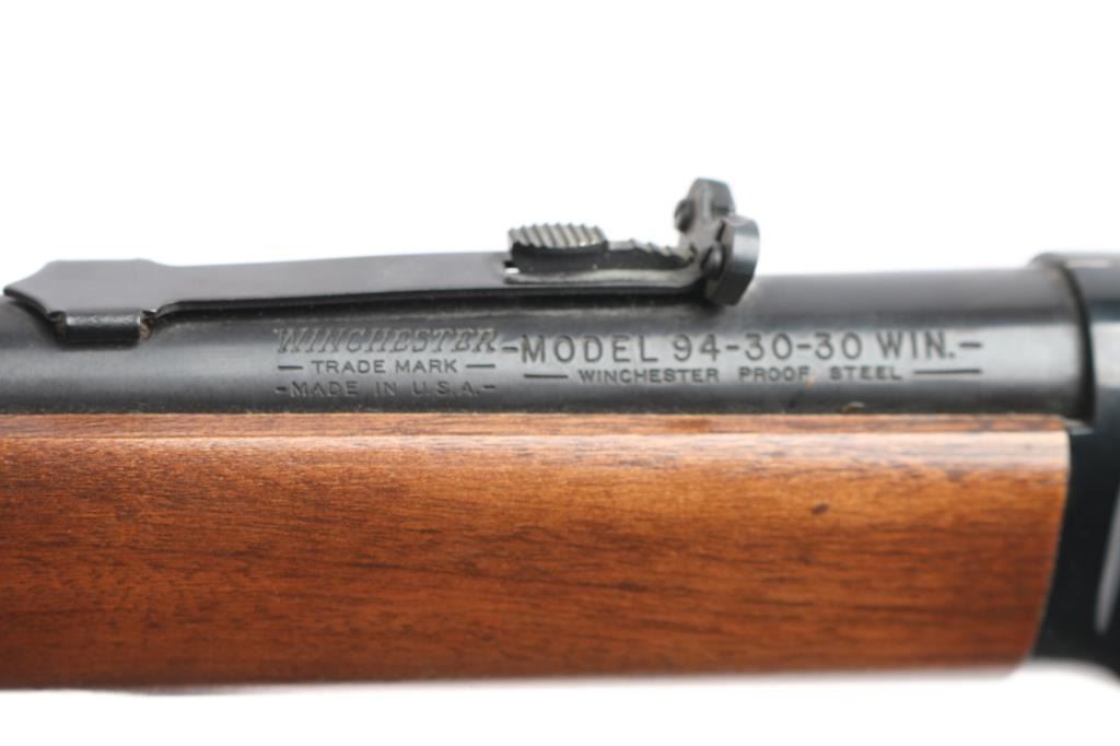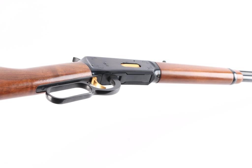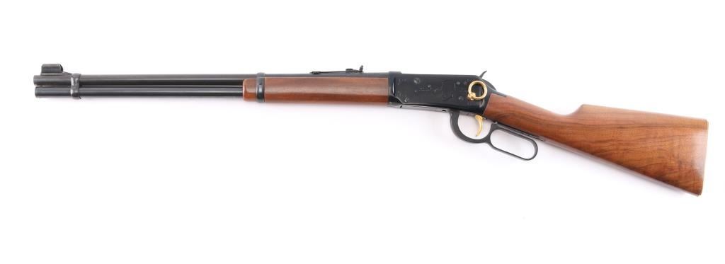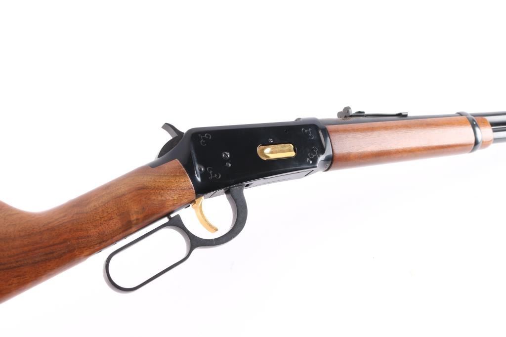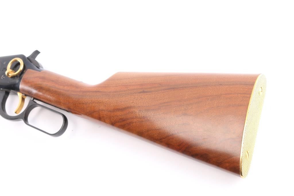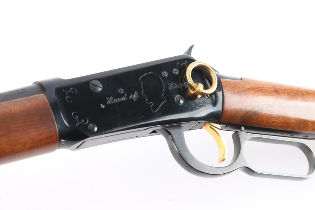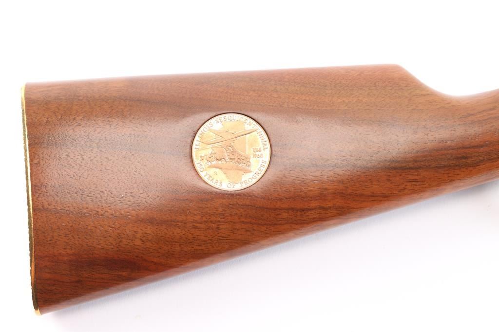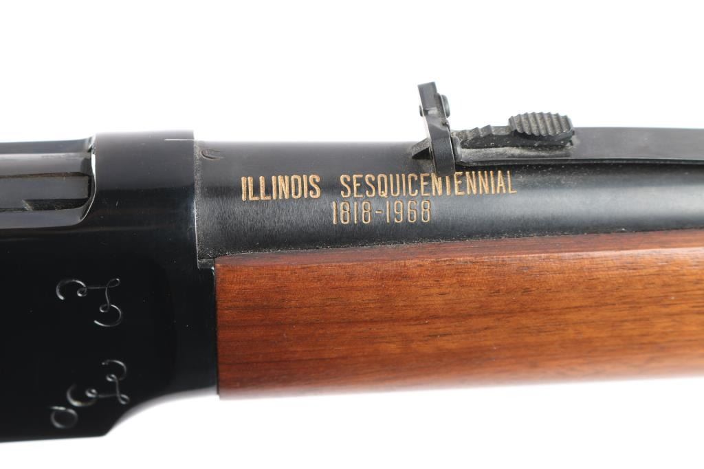 #IS7297. Commemorative lever action repeating rifle celebrating the Illinois Sesquicentennial 1818-1968. Manufactured circa 1968 with only 37,648 reported to have been produced. Features a blued & glossy black finish with gold accents, light coverage roll stamp engraving on the receiver, 20" tapered barrel, full-length tube magazine, ramped & hooded blade front sight with bead top, elevation adjustable rear sporting sight, smooth gold toned trigger with beveled edges, serrated hammer spur, grip safety, gold toned saddle ring, two barrel bands, smooth fancy figured walnut forend and straight grip shoulder stock with inlayed Illinois Sesquicentennial coin on the right side,lower right barrel stamped is gold toned 'Illinois Sesquicentennial 1818-1968', left receiver stamped "Land of Lincoln" with profile of Abraham Lincoln in the middle. knurled gold toned metal buttplate. Rifle retains approximately 98% of its original finish showing a couple of minor scratches. Action is smooth, the bore is excellent and the wood stocks are fine,
