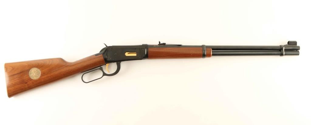 SN: IS4332 Lever action repeating rifle chambered in .30-30 Winchester. Manufactured circa 1968 with 37,648 reported to have been produced. Features a blued/glossy black finish with gold accents, 20" tapered barrel, full-length tube magazine, ramped & hooded blade front sight with bead top, adjustable rear sporting sight, light coverage engraving on the receiver, saddle ring, smooth trigger with beveled edges, serrated hammer spur, grip safety, smooth wood forend and straight grip shoulder stock with inlayed Illinois Sesquicentennial coin on the right side & metal buttplate. Rifle exhibits approximately 97% of it's original finish showing light wear and a minor amount of light surface rust. Action is smooth, the bore appears very good but dirty and the wood stocks are very good+. Condition is near NRA Very Good. ***C&R Firearm***
