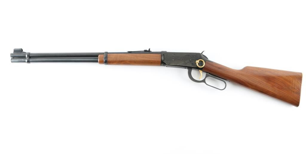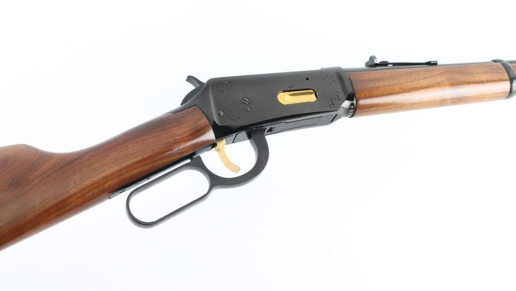 .30-30 SN: IS17116 Commemorative lever action repeating rifle celebrating the Illinois Sesquicentennial 1818-1968. Manufactured circa 1968 with only 37,648 reported to have been produced. Features a blued & glossy black finish with gold accents, light coverage roll stamp engraving on the receiver, 20" tapered barrel, full-length tube magazine, ramped & hooded blade front sight with bead top, elevation adjustable rear sporting sight, smooth trigger with beveled edges, serrated hammer spur, grip safety, saddle ring, two barrel bands, smooth fancy figured walnut forend and straight grip shoulder stock with inlayed Illinois Sesquicentennial coin on the right side & knurled metal buttplate. Rifle retains approximately 98% of its original finish showing scattered handling marks/scratches. Action is smooth, the bore is excellent and the wood stocks are fine with minor blemishes. Condition is near NRA Excellent *** C&R Firearm ***