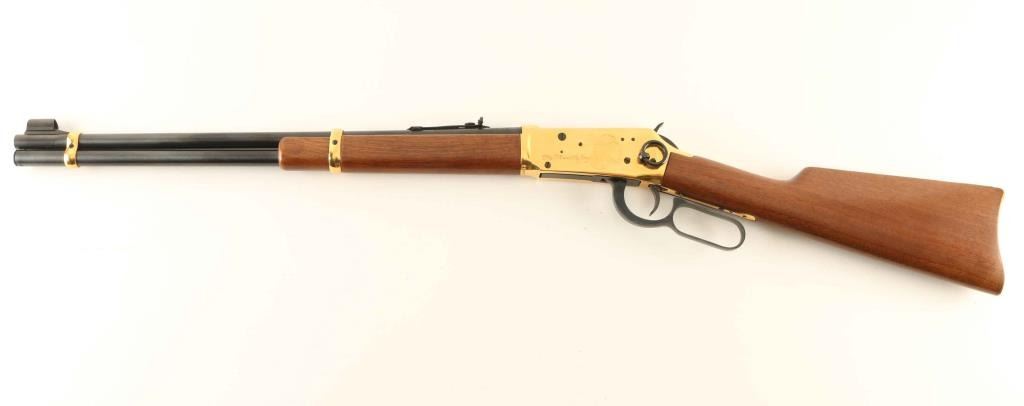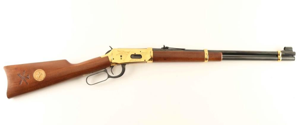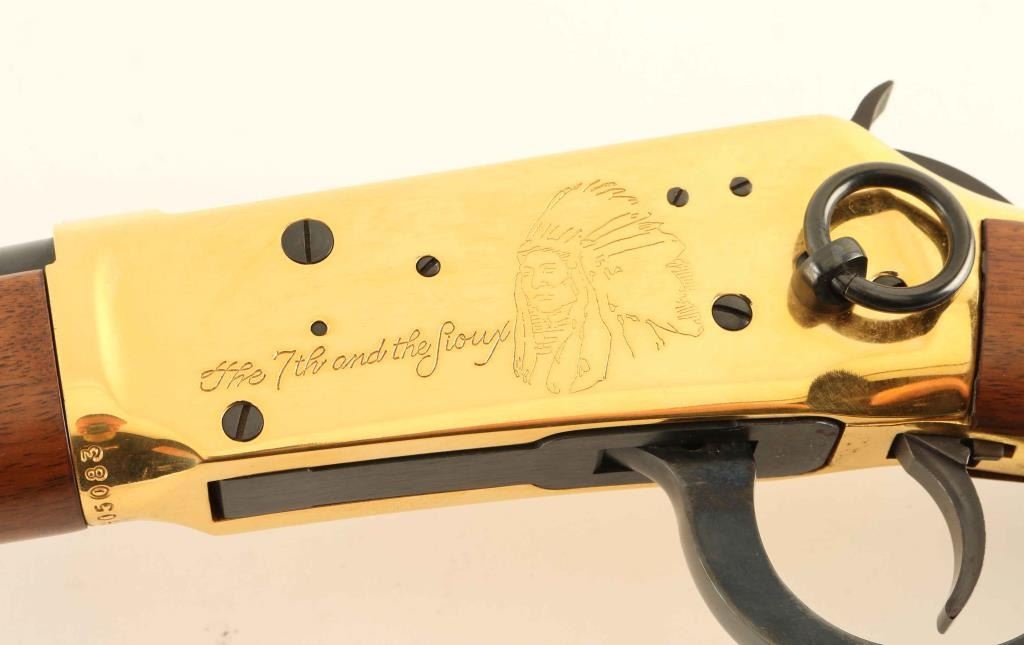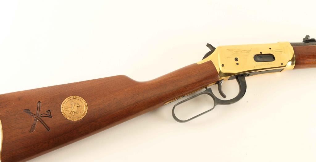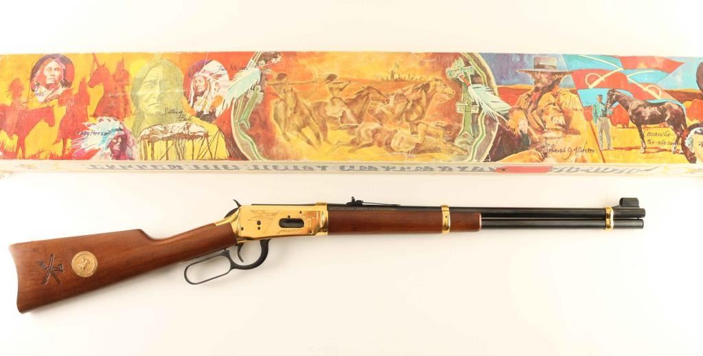 .44-40 Win SN: LBH05083 'SRC' Commemorative lever action repeating rifle celebrating the 100 year anniversary of the Battle of the Little Bighorn, chambered in .44-40 Winchester. One of only 11,000 produced for the Canadian market, circa 1976. Features a blued 20" round barrel, full-length tube magazine,ramped & hooded blade front sight with bead top, adjustable rear sporting sight, brass colored receiver with roll-stamp engraving, smooth trigger with beveled edge, serrated hammer spur, saddle ring, grip safety, brass colored barrel bands, smooth walnut forend with satin finish, and straight grip shoulder stock with brass colored metal carbine buttplate, inlayed commemorative medallion, & a large 7th Calvalry cartouche on the right side. Includes the original cardboard sleeve & styrofoam inserts with matching label and instruction sheet. Rifle exhibits approximately 95% of it's original finish showing minor handling marks and some light surface rust/pitting observed on the barrel & magazine tube. Action is smooth, the bore is pristine and the wood stocks are fine. The packaging is good. Condition is near NRA Very Good in box. ***C&R Firearm***