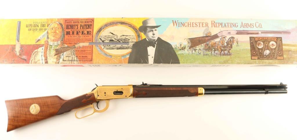 SN: OFW18881 Commemorative lever action repeating rifle celebrating the company's founder, chambered in .38-55 Winchester. One of only 19,999 produced, circa 1980. Features a blued 24" octagon barrel, full-length tube magazine, dovetailed blade front sight, adjustable rear sporting sight, brass colored receiver with elaborated roll-stamp engraving, smooth trigger with beveled edge, serrated hammer spur, grip safety, fancy checkered walnut forend with brass colored metal cap, and straight grip shoulder stock with inlayed commemorative medallion on the right side & curved metal buttplate. Includes the original cardboard sleeve & styrofoam inserts with matching label. Rifle exhibits approximately 99% of it's original finish showing minor handling marks and few pits in the magazine tube. Action is smooth, the bore is pristine and wood stocks are fine. The packaging is fair to good. Condition is near NRA Excellent in box. ***C&R Firearm***