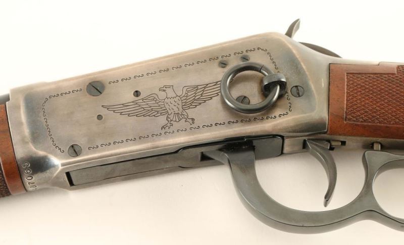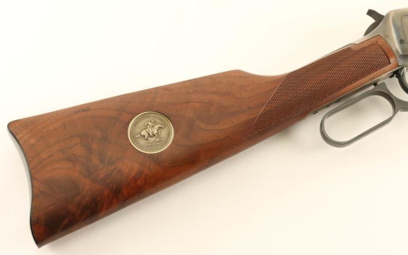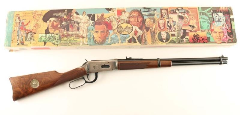 SN: USA07065 Commemorative 'SRC', one of only 19,999 produced in 1976. Blued 20" bbl, full length tube magazine, open sights, saddle ring, antique finish on the receiver, checkered deluxe walnut forend and straight grip shoulder stock with metal carbine buttplate & inlayed medallion on the right side. Drilled & tapped receiver for a side mount sight. Includes the original factory Styrofoam box with correct label, document, hand tag, sleeve and a Bicentennial horn rifle rack. Rifle is in near new condition. ***C&R Firearm***