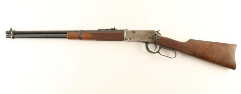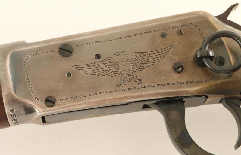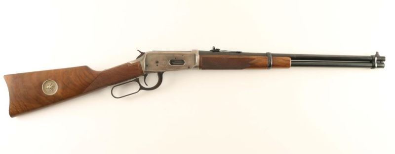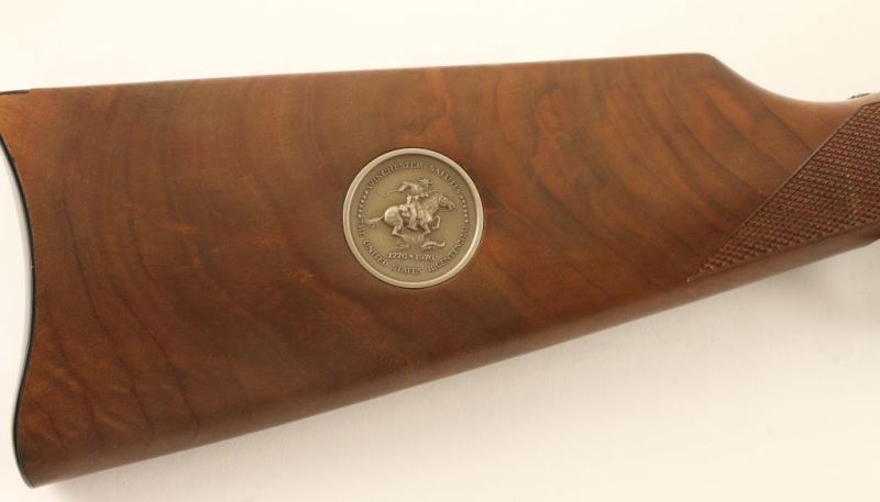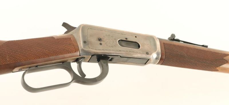 SN: USA16864 'SRC' Commemorative lever action repeating rifle celebrating 200 years of American liberty, chambered in .30-30 Winchester. One of only 19,999 produced, circa 1976. Features a blued 20" barrel, full-length magazine tube, dovetailed blade front sight, adjustable rear sporting sight, saddle ring, antique finished receiver with rolled stamped eagle & "76" decor, serrated hammer spur, smooth trigger, checkered deluxe walnut forend and straight grip shoulder stock with metal carbine buttplate & inlayed medallion on the right side. Rifle exhibits approximately 98%+ of it's original finish showing few light handling marks/losses and has spots of what appears to be dried grease on the top of the buttplate, bolt, rear sight & barrel. Action is smooth, bore is pristine and wood stocks are fine. Condition is NRA excellent. ***C&R Firearm***